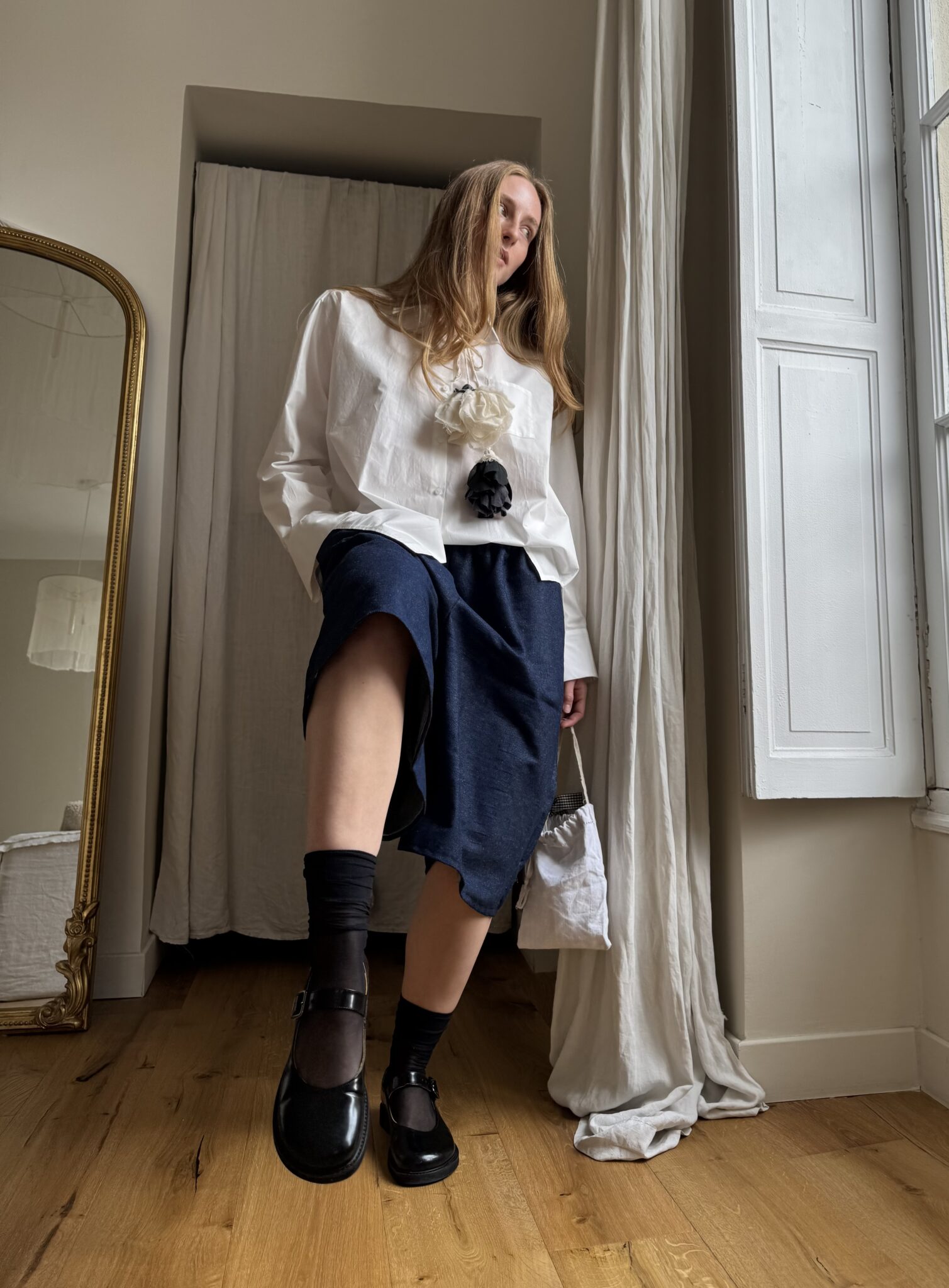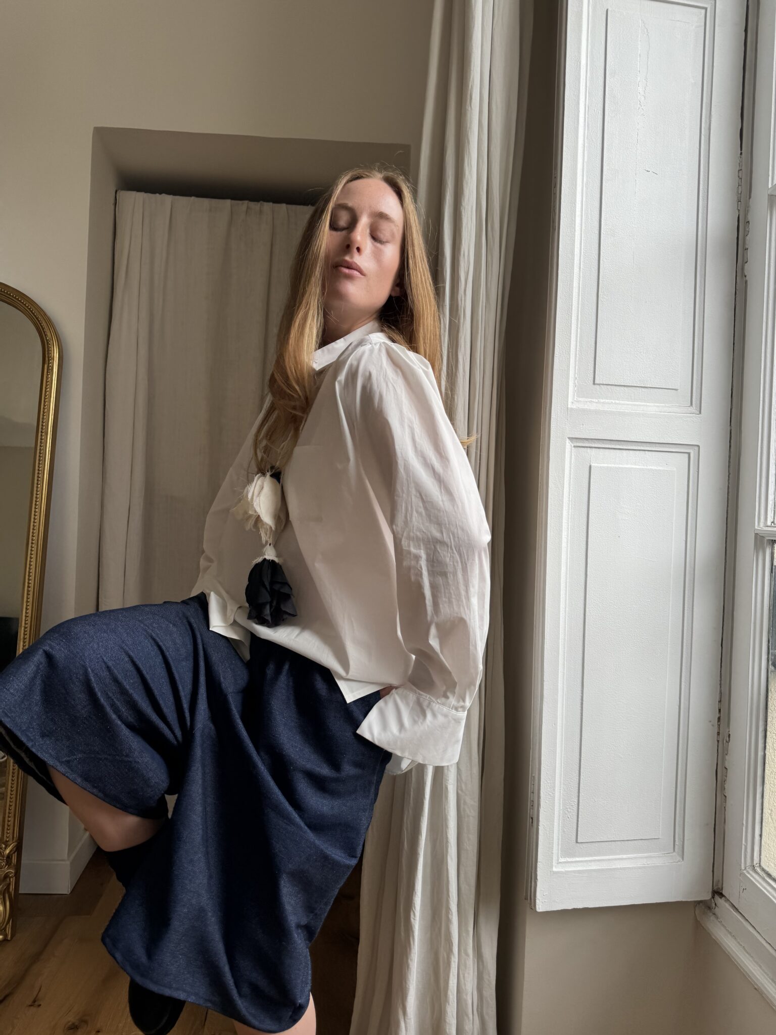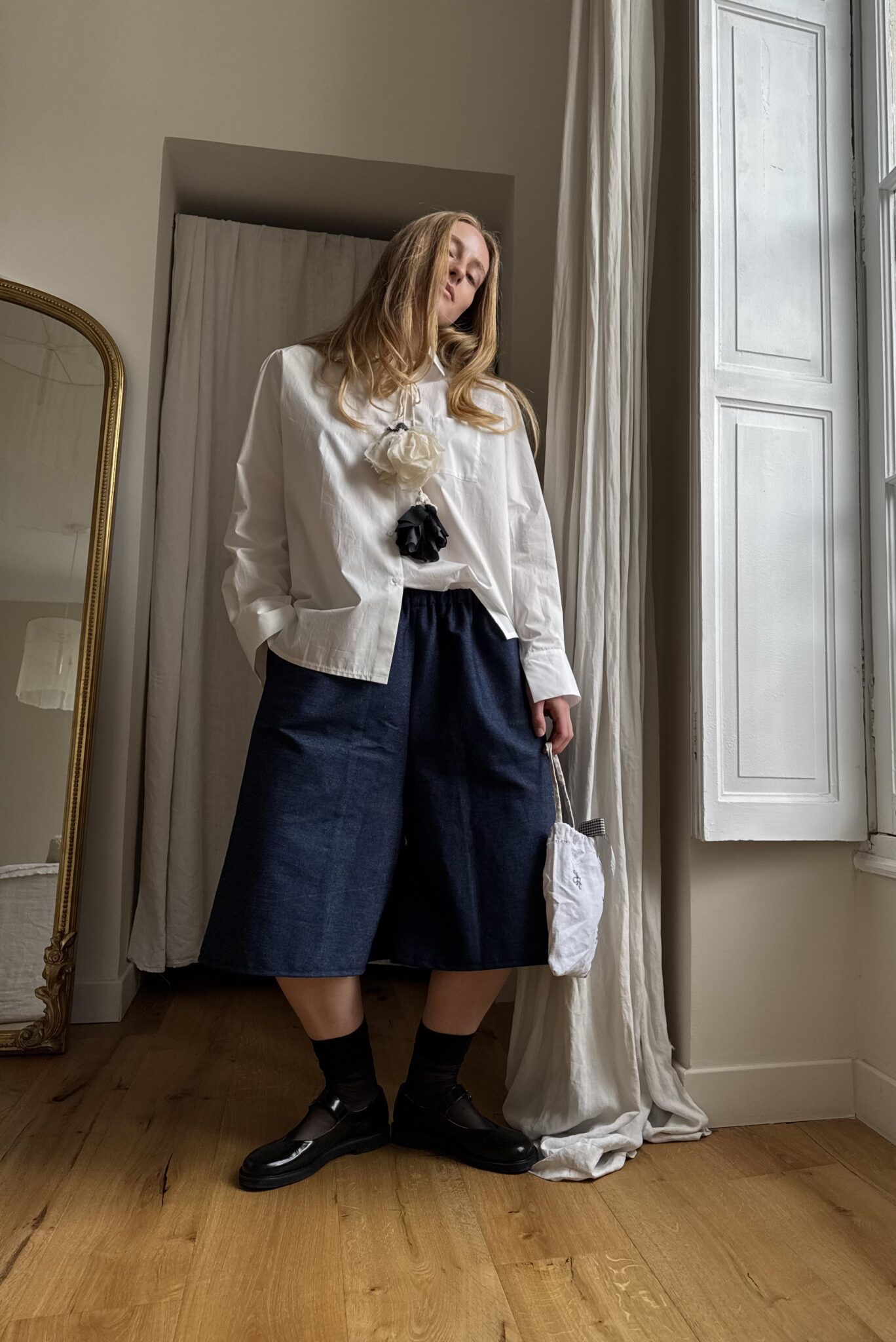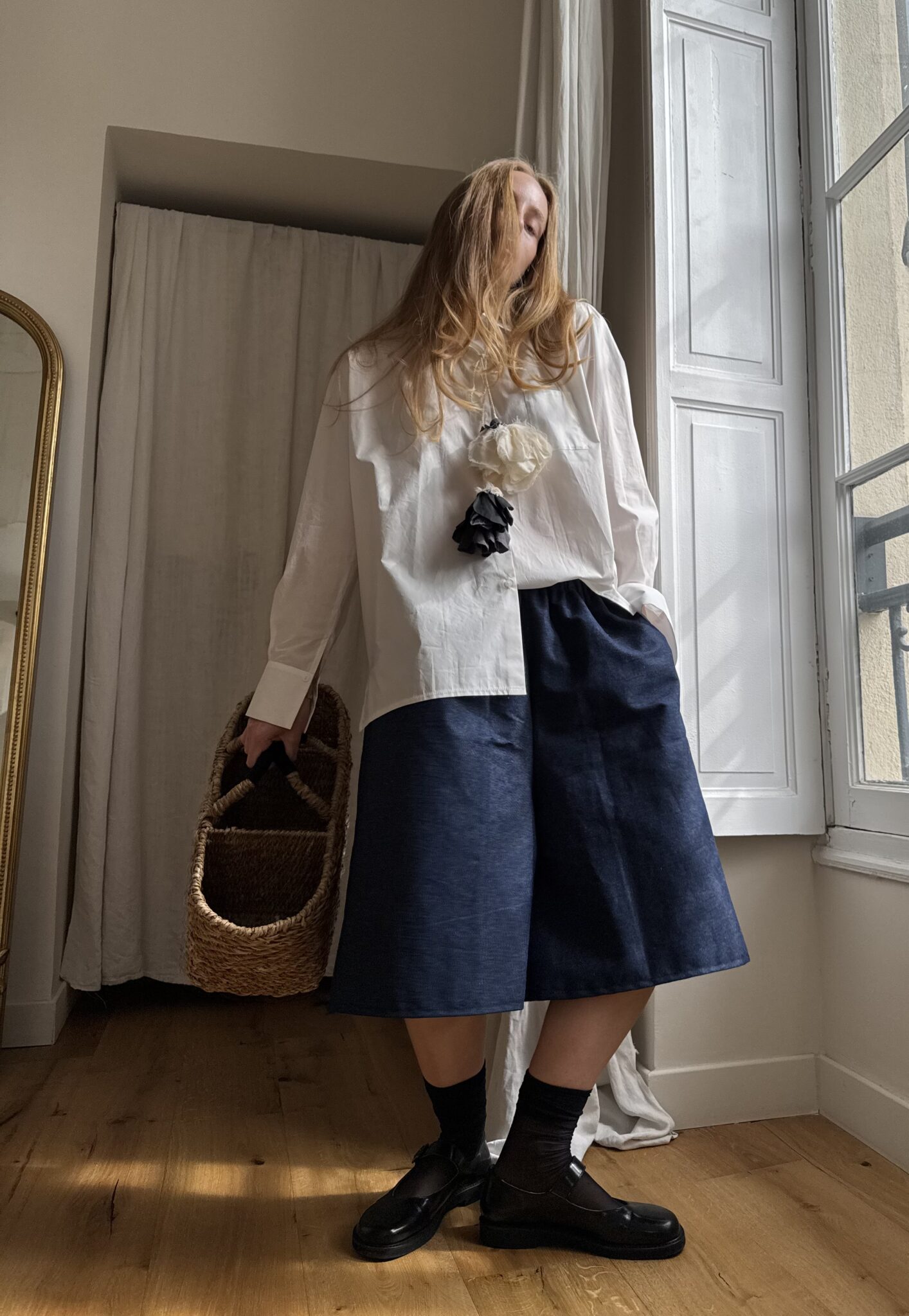 Bermuda « ÉTIENNE » en jean brut. Taille froncée sur élastique, poches latérales. Une coupe minimaliste.