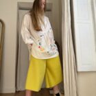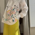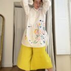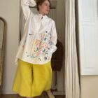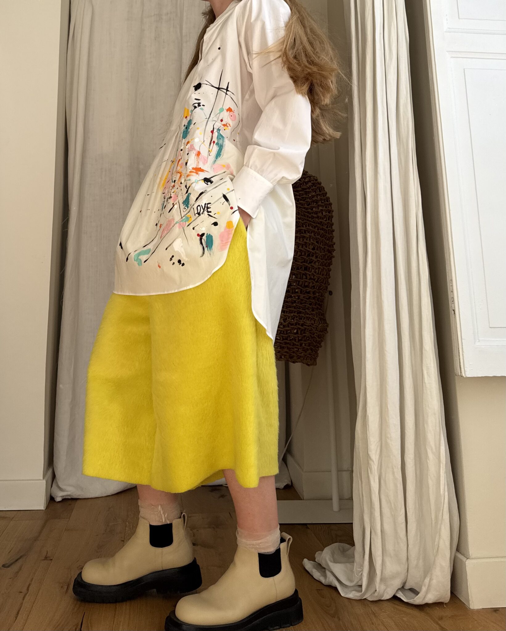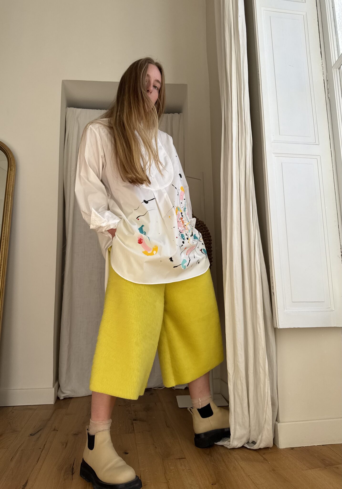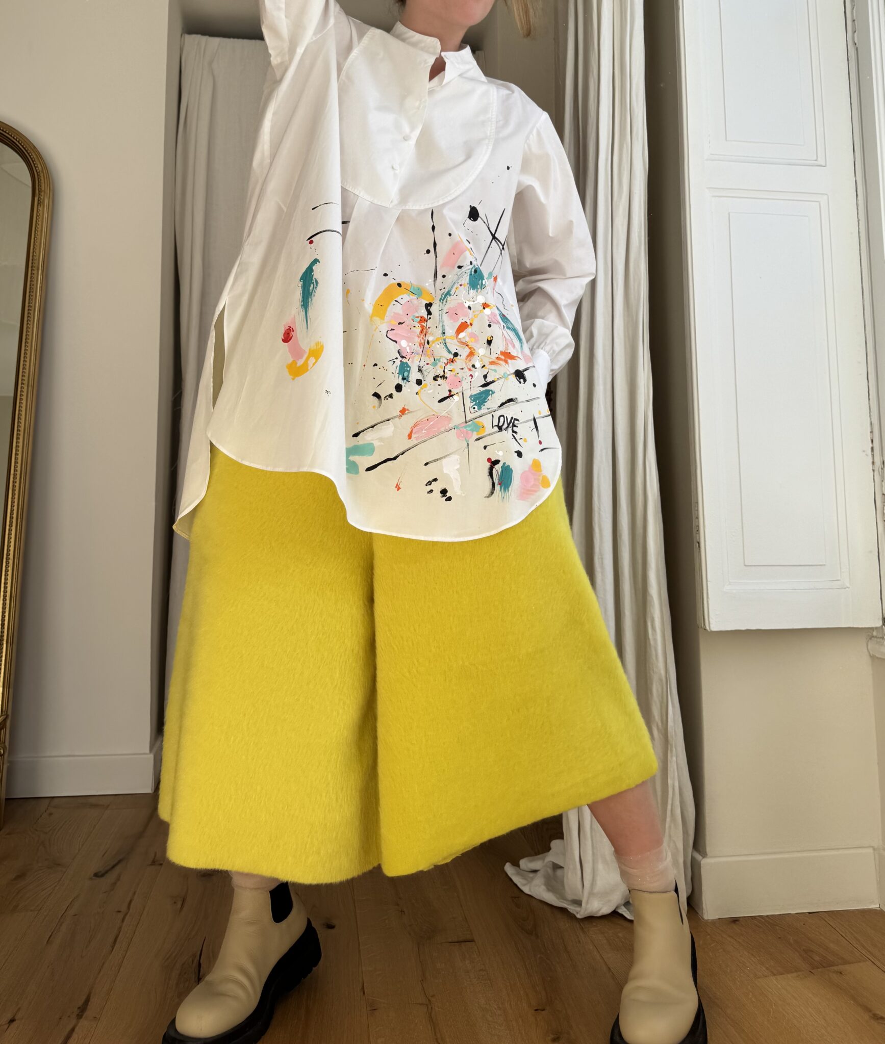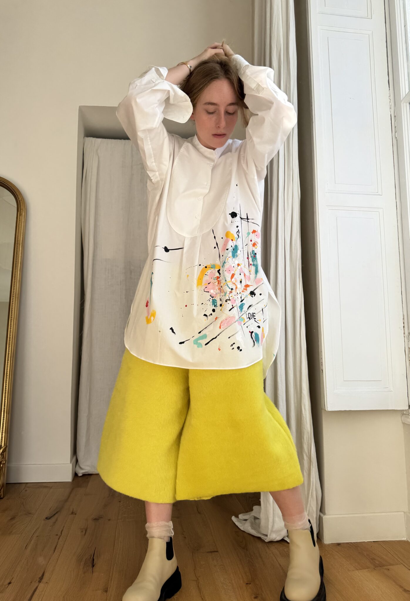 Blouse « CHARLIE » en popeline de coton écru, peinte main. Boutons, plastron, plis plats, poignets froncés et boutonnés. Fente et arrondi sur les côtés en bas de chemisier. Une coupe minimaliste, inspirée des blouses vintage de grands-pères, pour un chemisier élégant. PIÈCE UNIQUE.