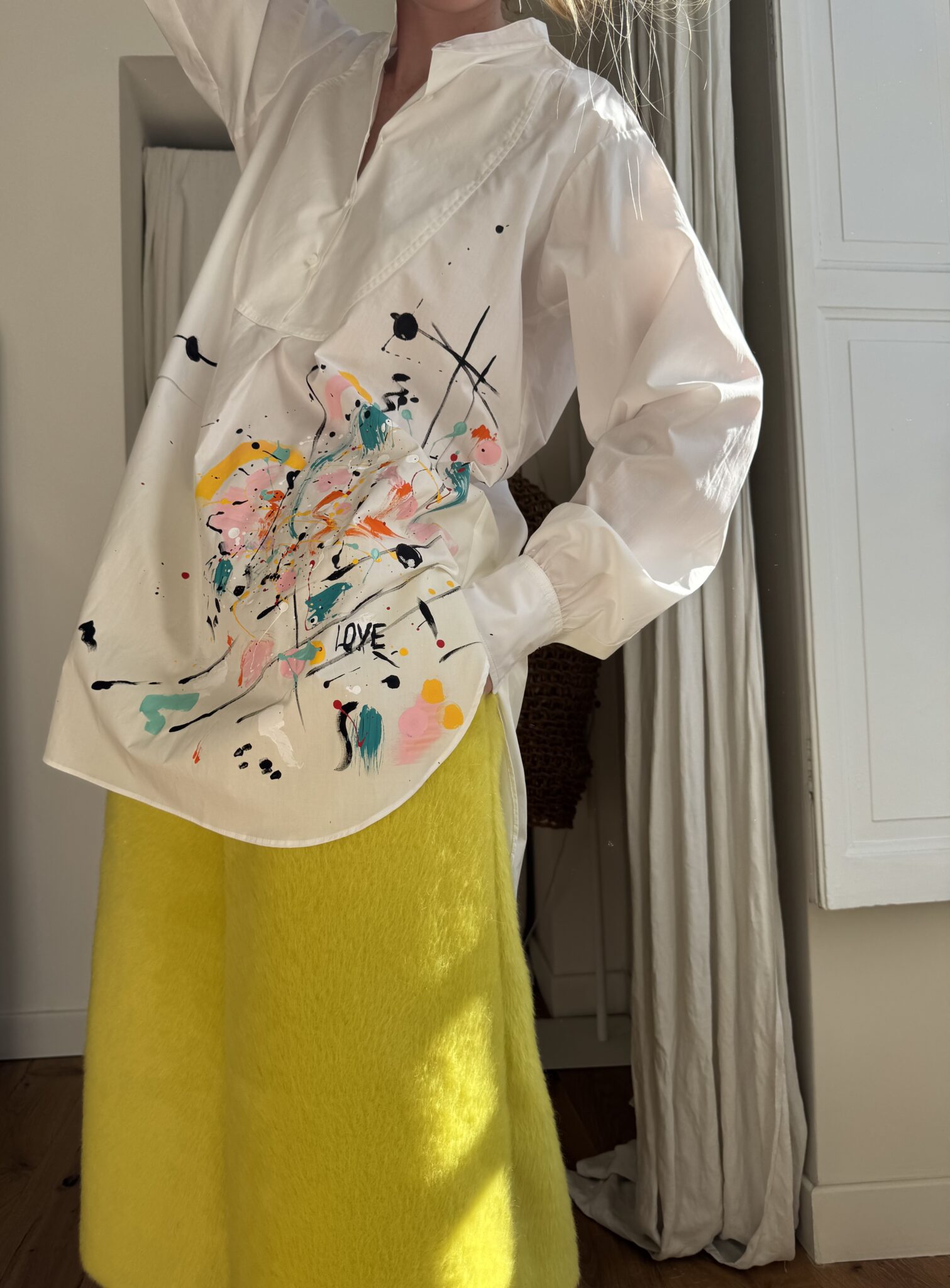 Entretien : Lavage machine 30 degrés maximum conseillé. Repasser la chemise à l’envers en plaçant une pattemouille entre la peinture et la fer à repasser.