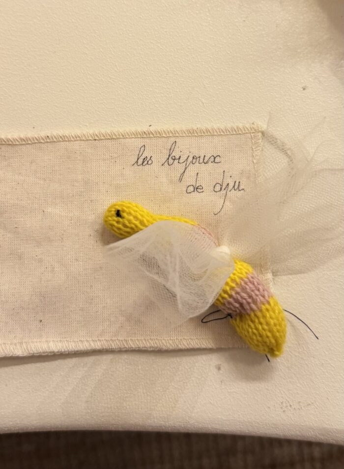 Broche abeille tricotée main, laine et tulle. Une pièce unique et poétique.