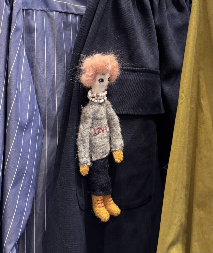 Broche « Mademoiselle DJU » tricotée et brodée main. Une pièce unique et poétique tel un bijoux.