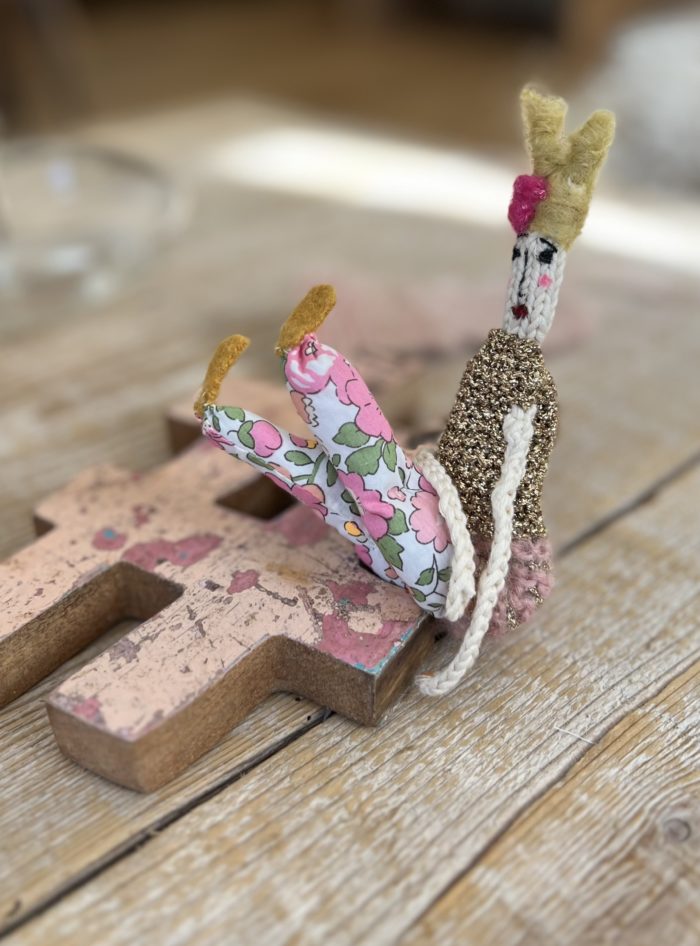 Broche « Mademoiselle DJU » vêtue d’un pantalon en coton Liberty of London, d’un pull tricoté main en fil lurex doré et mohair, chaussures en laine bouillie, et chignons en mohair. Une pièce unique et poétique tel un bijoux.
