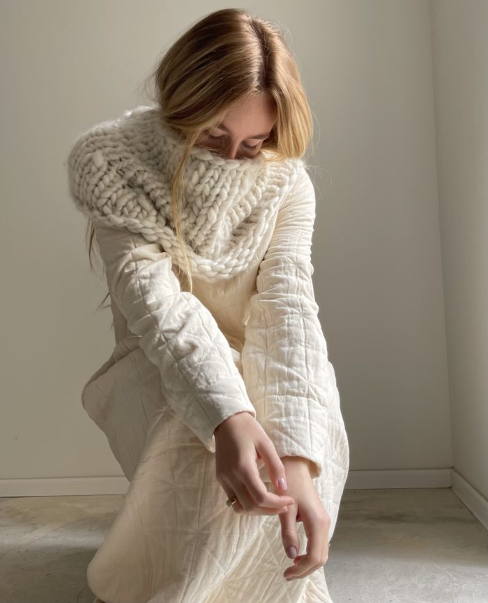 Cache-épaules tricoté main en laine alpaga écru d’une douceur inégalée. PIÈCE UNIQUE