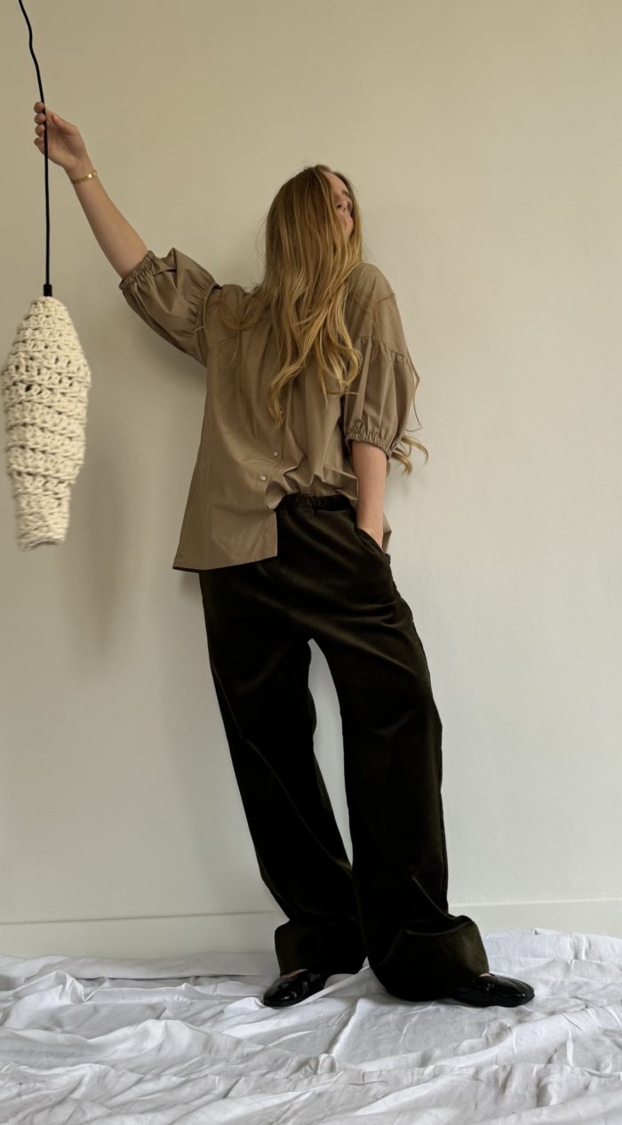 Chemisier « ÉLISE » en popeline de coton beige. Joli col, manches 3/4 ballons et bouffantes. Jolies fronces au dos, aux épaules et aux manches. Chemisier boutonné à la coupe minimaliste et élégante. PIÈCE UNIQUE