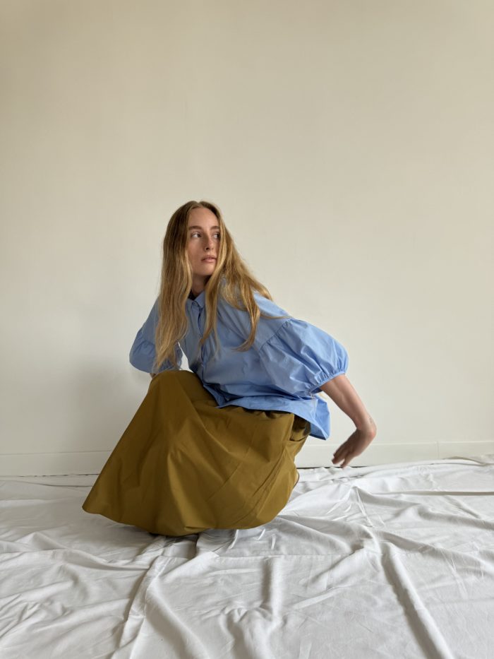 Chemisier « ÉLISE » en popeline de coton bleu. Joli col, manches 3/4 ballons et bouffantes. Jolies fronces au dos, aux épaules et aux manches. Chemisier boutonné à la coupe minimaliste et élégante. PIÈCE UNIQUE
