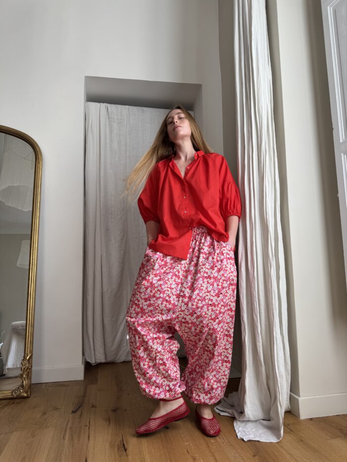 Chemisier « ÉLISE » en coton rouge coquelicot. Joli col, manches 3/4 ballons et bouffantes. Jolies fronces au dos, aux épaules et aux manches. Chemisier boutonné à la coupe minimaliste et élégante. PIÈCE UNIQUE