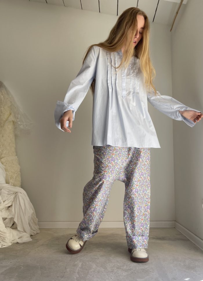 Chemisier « LILY » en popeline de coton bleu ciel, plis plats, boutons nacrés, bas du chemisier légèrement arrondi, petites fronces dans le dos. Une coupe minimaliste et élégante. PIÈCE UNIQUE