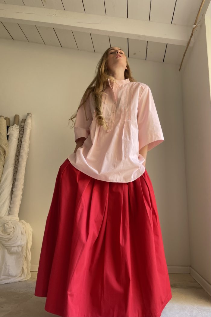 Chemisier « LILY » en popeline de coton rose pâle, manches 3/4, plis plats, petites fronces dans le dos. Une coupe minimaliste et élégante. PIÈCE UNIQUE