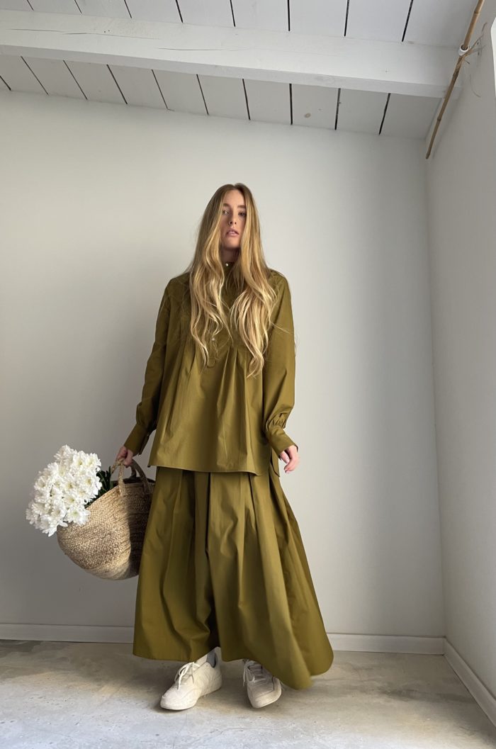 Chemisier « LILY » en popeline de coton vert olive, plis plats, boutons nacrés, bas du chemisier légèrement arrondi, petites fronces dans le dos. Une coupe minimaliste et élégante. PIÈCE UNIQUE
