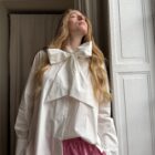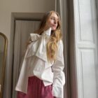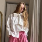 Chemisier « LUCIE » en popeline de coton blanche, entièrement boutonnée, col lavallière, poignets boutonnés. Froncés au dos et aux poignets. Une coupe minimaliste et élégante.