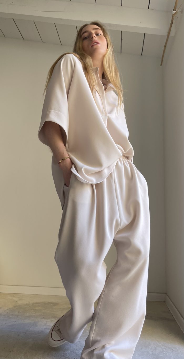 Chemisier « LUCIE » dans un sublime crêpe écru haute couture, manches 3/4, col & décollé à pressions, petites fronces dans le dos. Une coupe minimaliste et élégante. PIÈCE UNIQUE