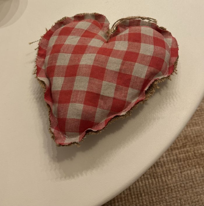 Cœur à suspendre à une poignée de porte ou à exposer en décoration. Recto en lin rouge à carreaux et verso en jute. PIÈCE UNIQUE