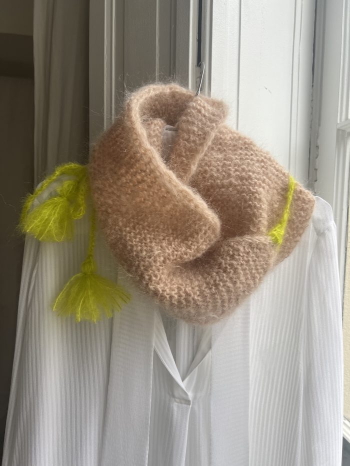 Écharpe tricoté main en kid mohair coloris rose coquille d’œuf. Pompon vert fluo. Douce tel un câlin. PIÈCE UNIQUE