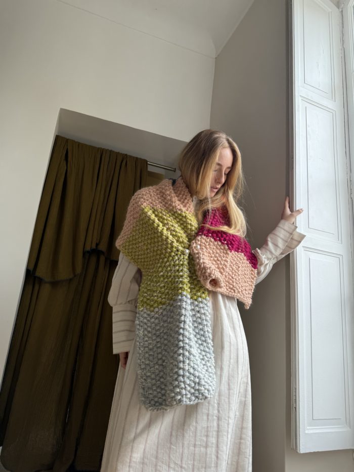 Écharpe tricotée main en 100% laine, au point de riz. Un mélange de couleurs de saison. Création poétique. PIÈCE UNIQUE