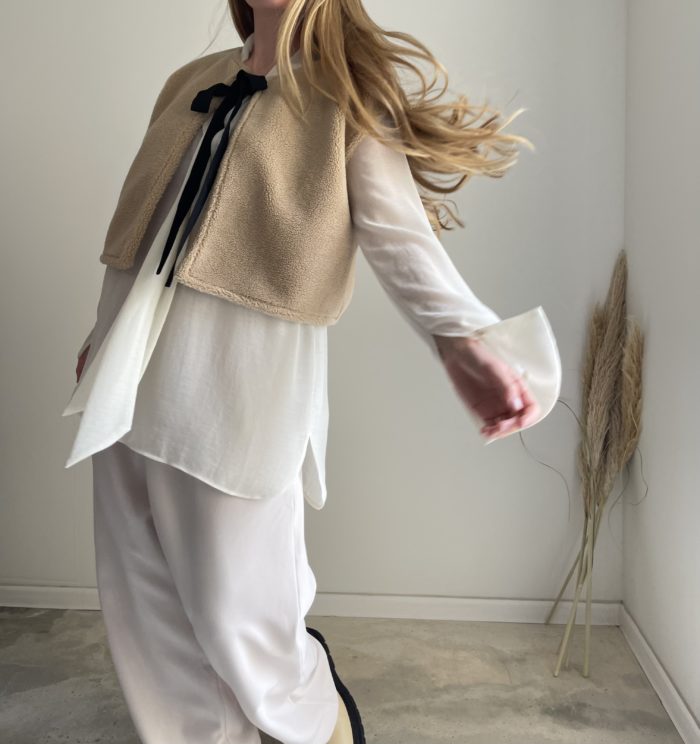Gilet sans manches dans un superbe tissu sherpa couleur sable. Cordon en crêpe de viscose haute couture. Doublure intégrable en coton écru. Une coupe minimaliste pour une pièce intemporelle. Une création unique idéale pour le printemps. PIÈCE UNIQUE