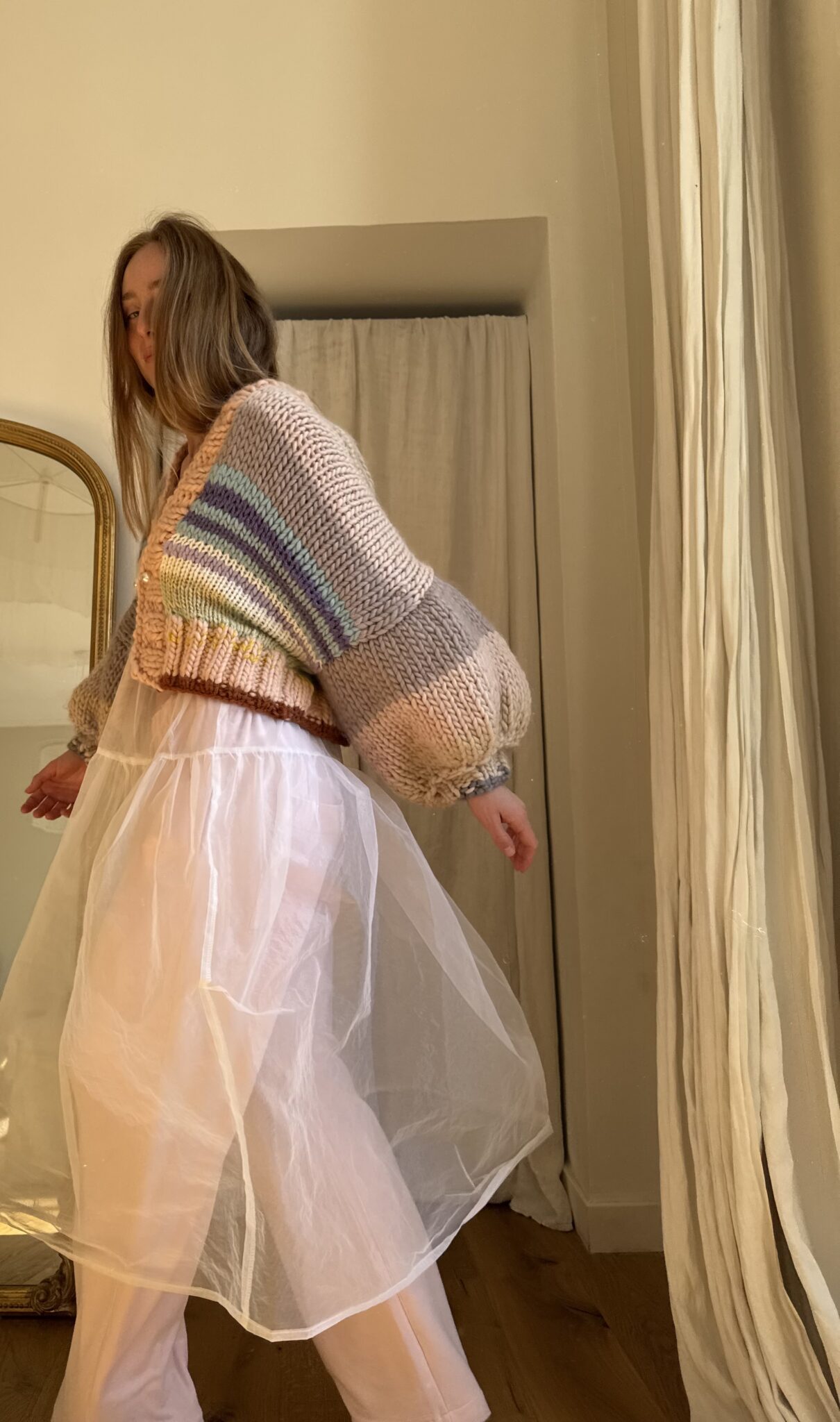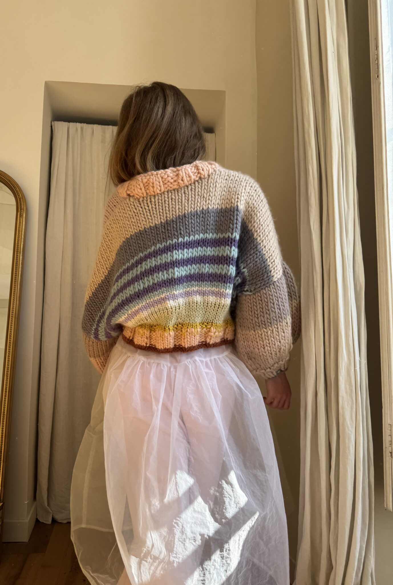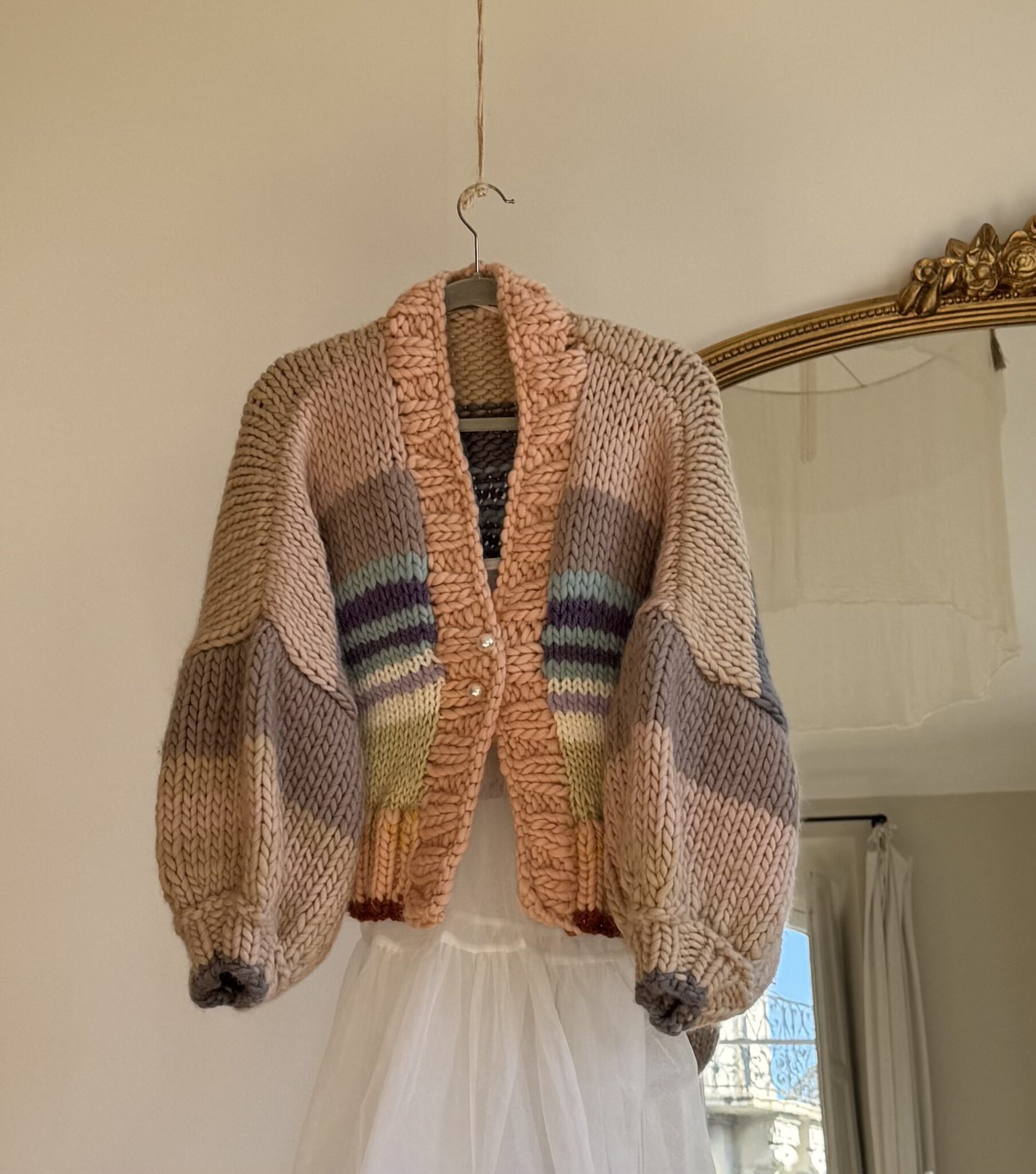 Gilet tricoté main en laine. Manches ballons, poignets resserrés. PIÈCE UNIQUE
