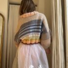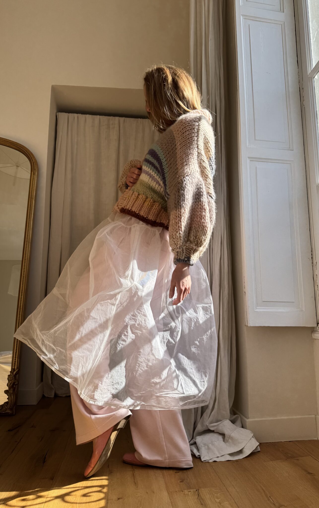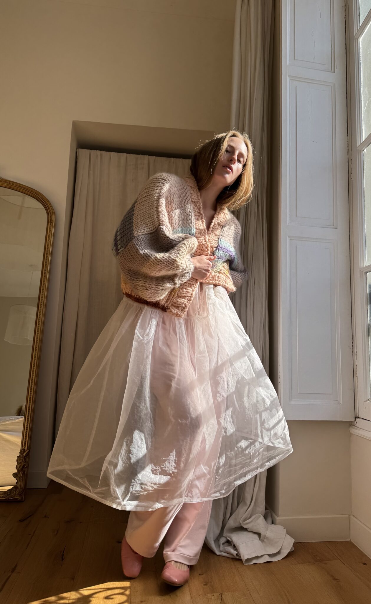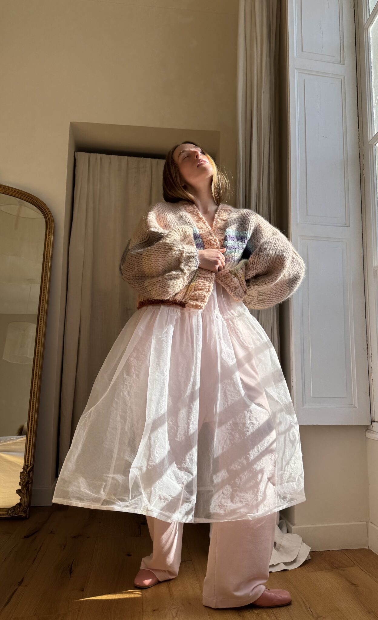 Gilet tricoté main en laine. Manches ballons, poignets resserrés. PIÈCE UNIQUE