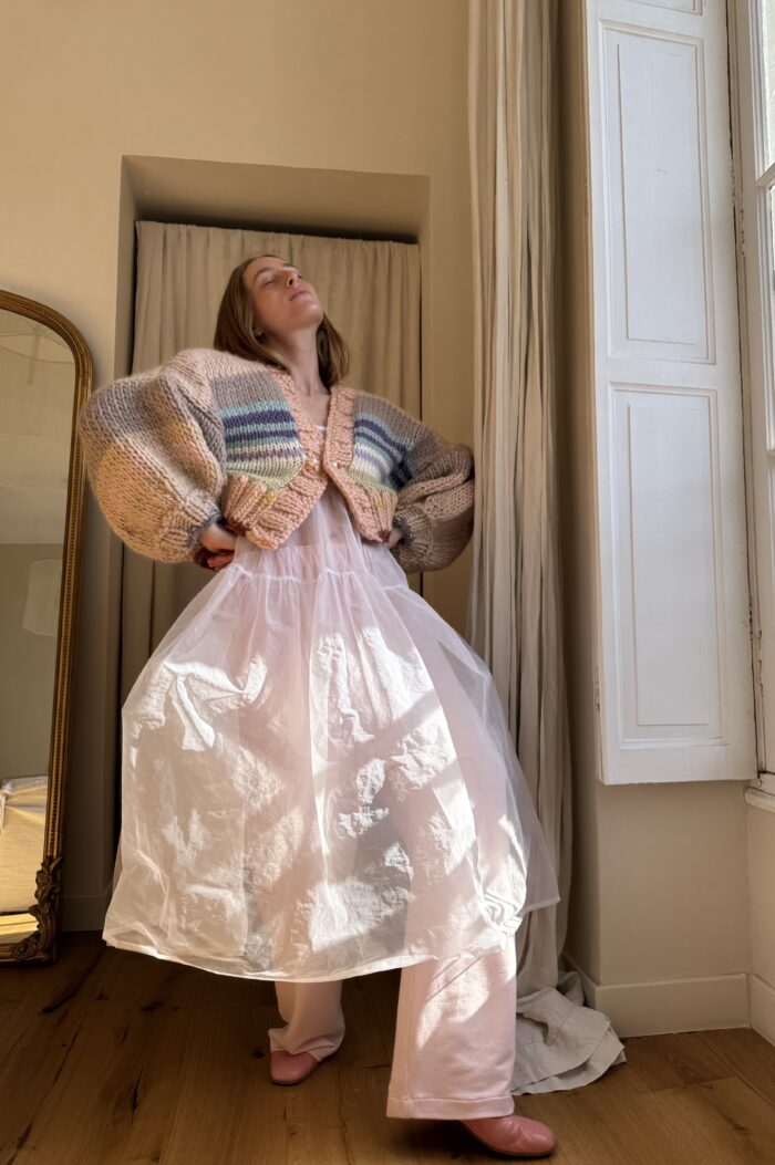 Gilet tricoté main en laine. Manches ballons, poignets resserrés. PIÈCE UNIQUE