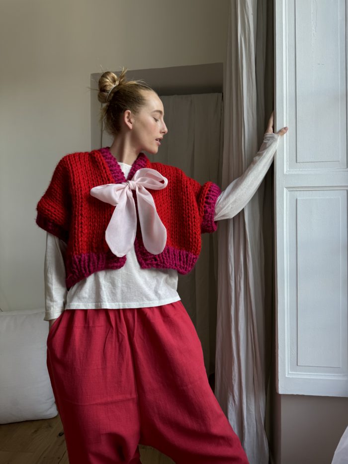 Gilet tricoté main en 100% laine. Coloris rouge & fuchsia. Noeud en organza de soie rose pâle. PIÈCE UNIQUEÂ