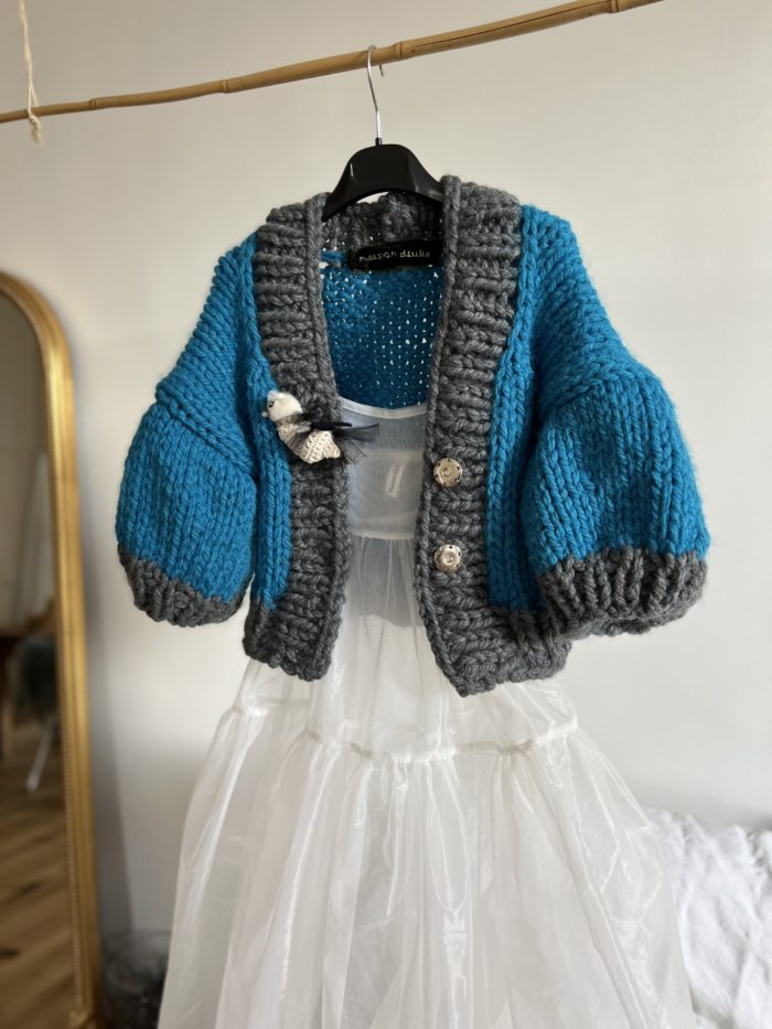 Gilet tricoté main en 100% laine acrylique. Coloris gris & bleu. Fermeture à pressions. PIÈCE UNIQUEÂ
