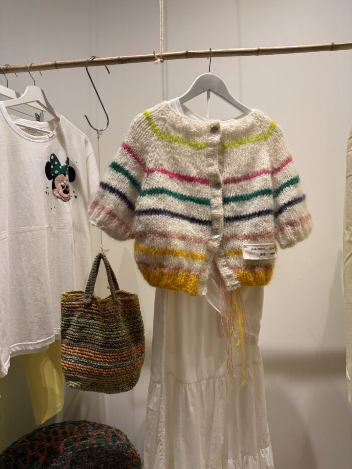 Gilet tricoté main en kid mohair. Boutons en nacre. Manches 3/4.