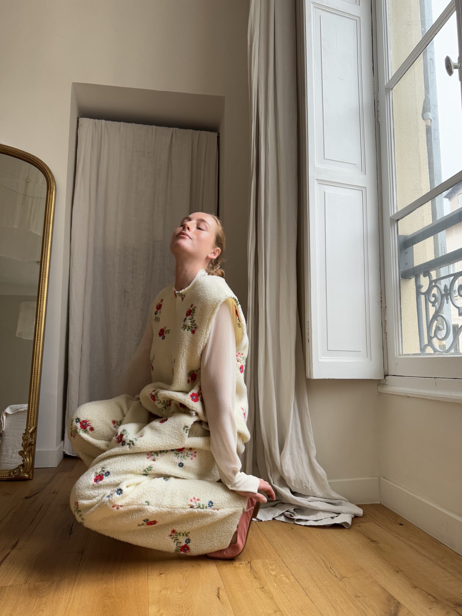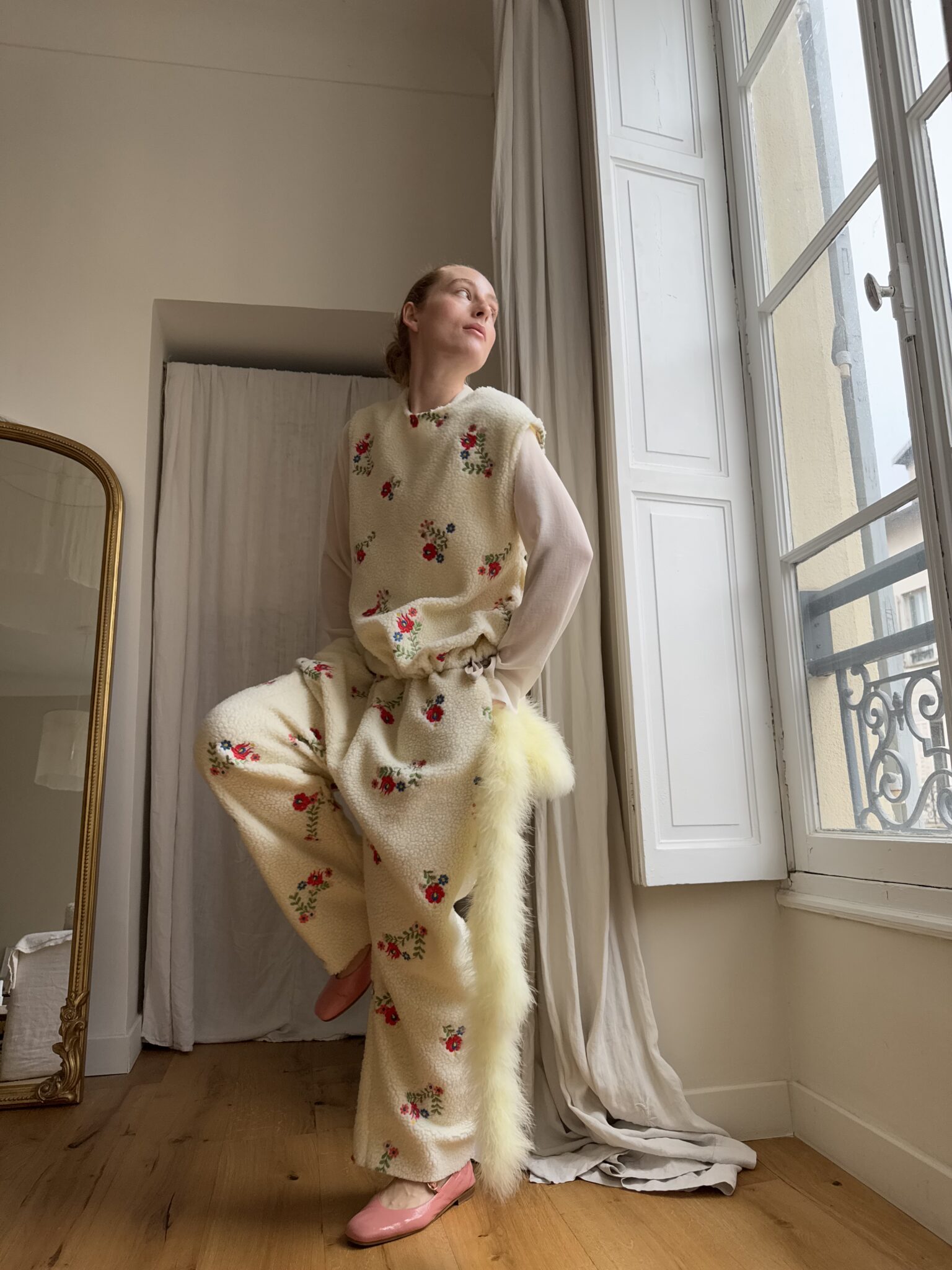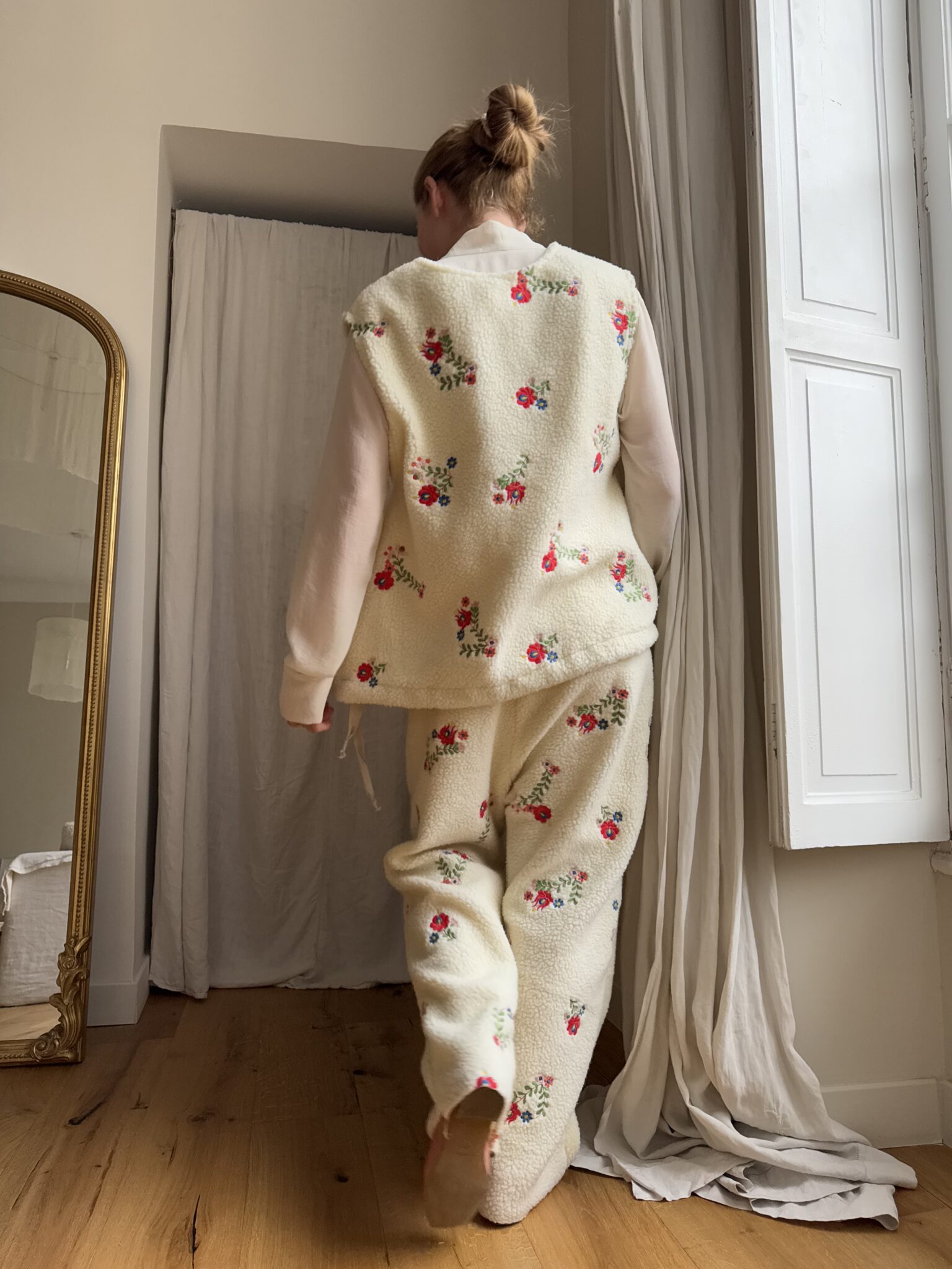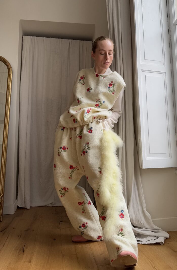 Haut « LÉON » sans manches, dans un tissu sherpa fleuri. Cordon en coton pour resserrer le bas du haut « LÉON ». Une coupe minimaliste & stylée.