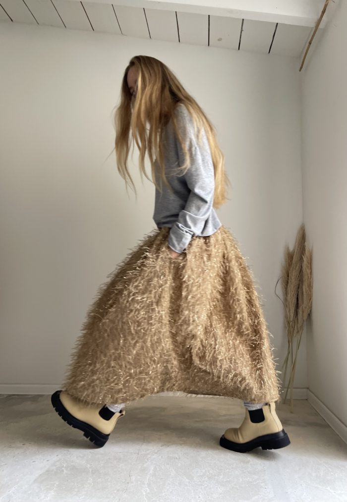 Jupe « AMBRE » dans un sublime tissu scintillant mordoré / bronze. Jupe longue, taille sur élastique, fronces, poches. Une jupe élégante, minimaliste et intemporelle. Un tissu unique pour une pièce unique.