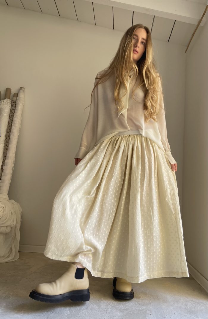 Jupe « AMBRE » dans un magnifique coton plumetis, doublure intégrable en coton, taille sur élastique. Légèrement transparente. Une jupe élégante, minimaliste et intemporelle. Pièce unique.