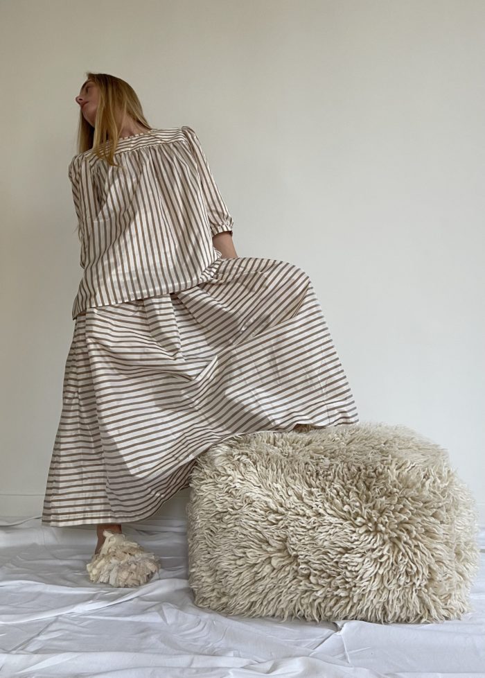 Jupe « MICHELLE » dans un sublime tissu taffetas à rayures écru & beige. Taille sur élastique, plis plats, poches. Une jupe élégante, minimaliste et intemporelle. Pièce unique.