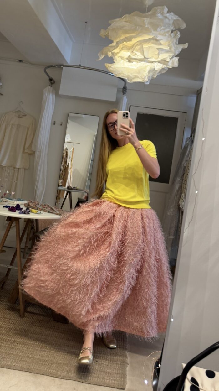 Jupe « MICHELLE » dans un sublime tissu scintillant rose, taille sur élastique, plis plats, poches latérales. Une jupe élégante, minimaliste et intemporelle. PIÈCE UNIQUE.