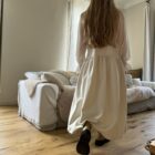 Jupe – Salopette dans un sublime crêpe écru. Création unique, à la coupe japonisante et minimaliste. Poches, non transparente. PIÈCE UNIQUE
