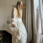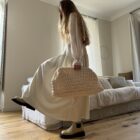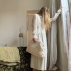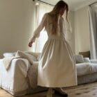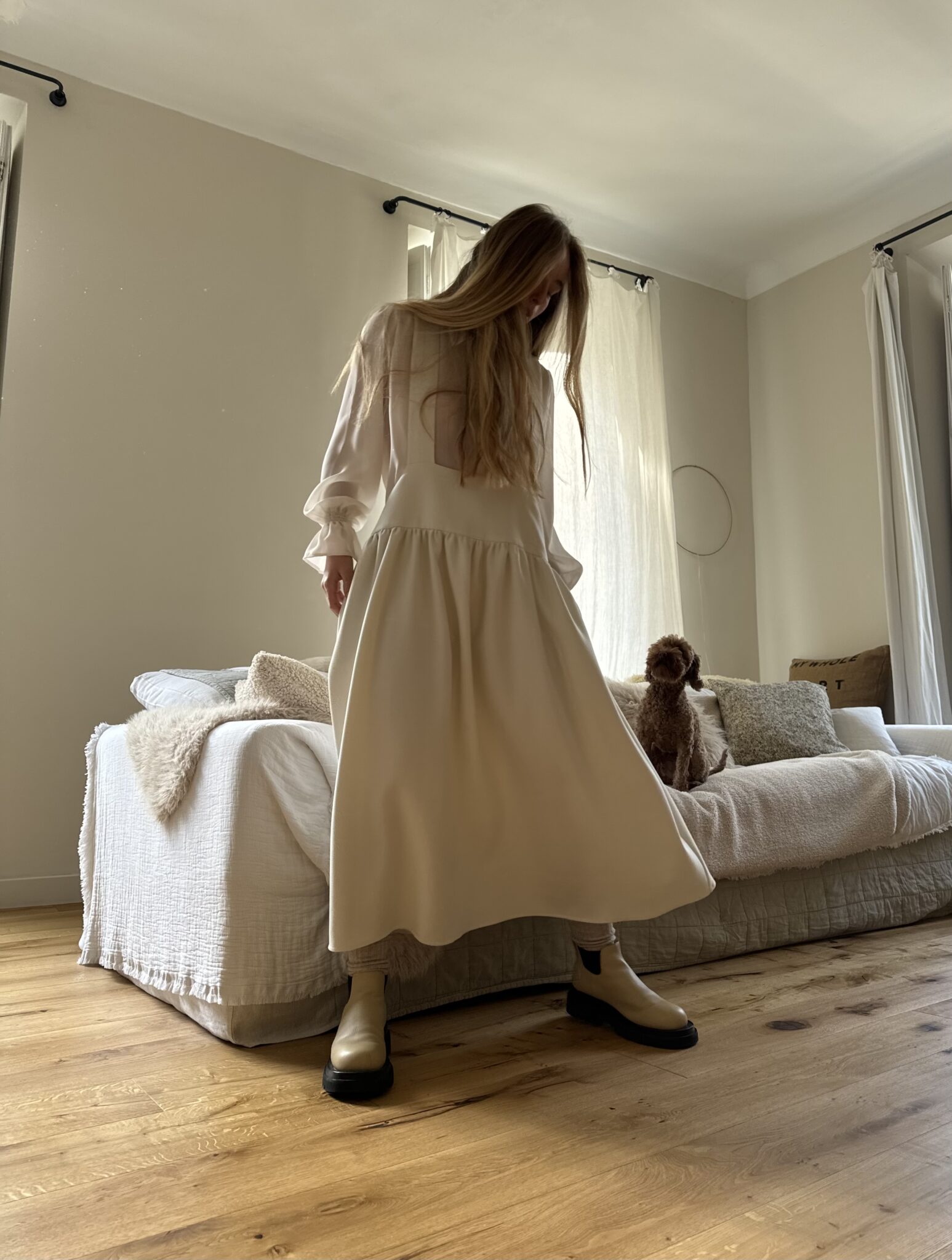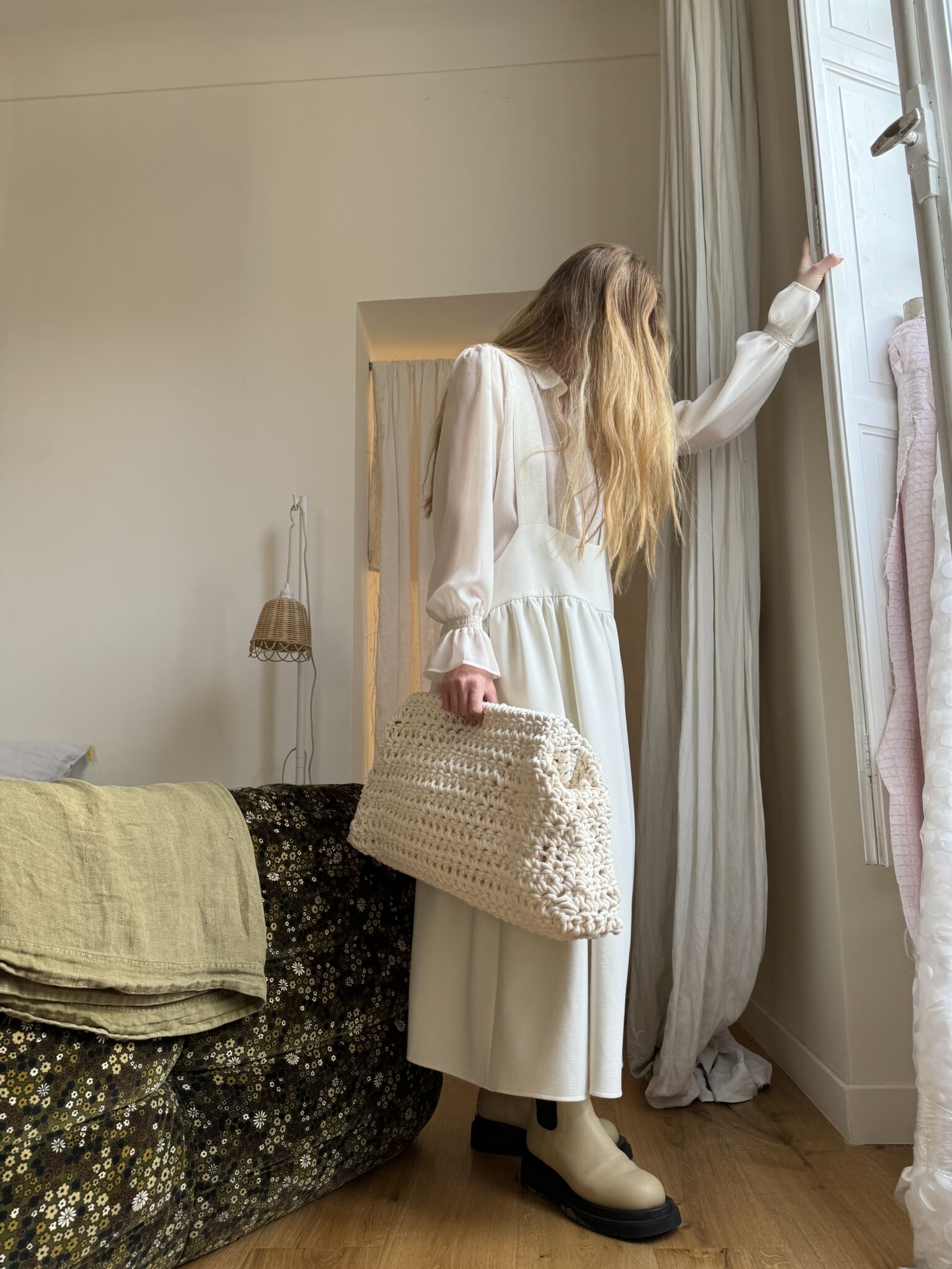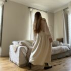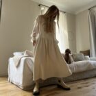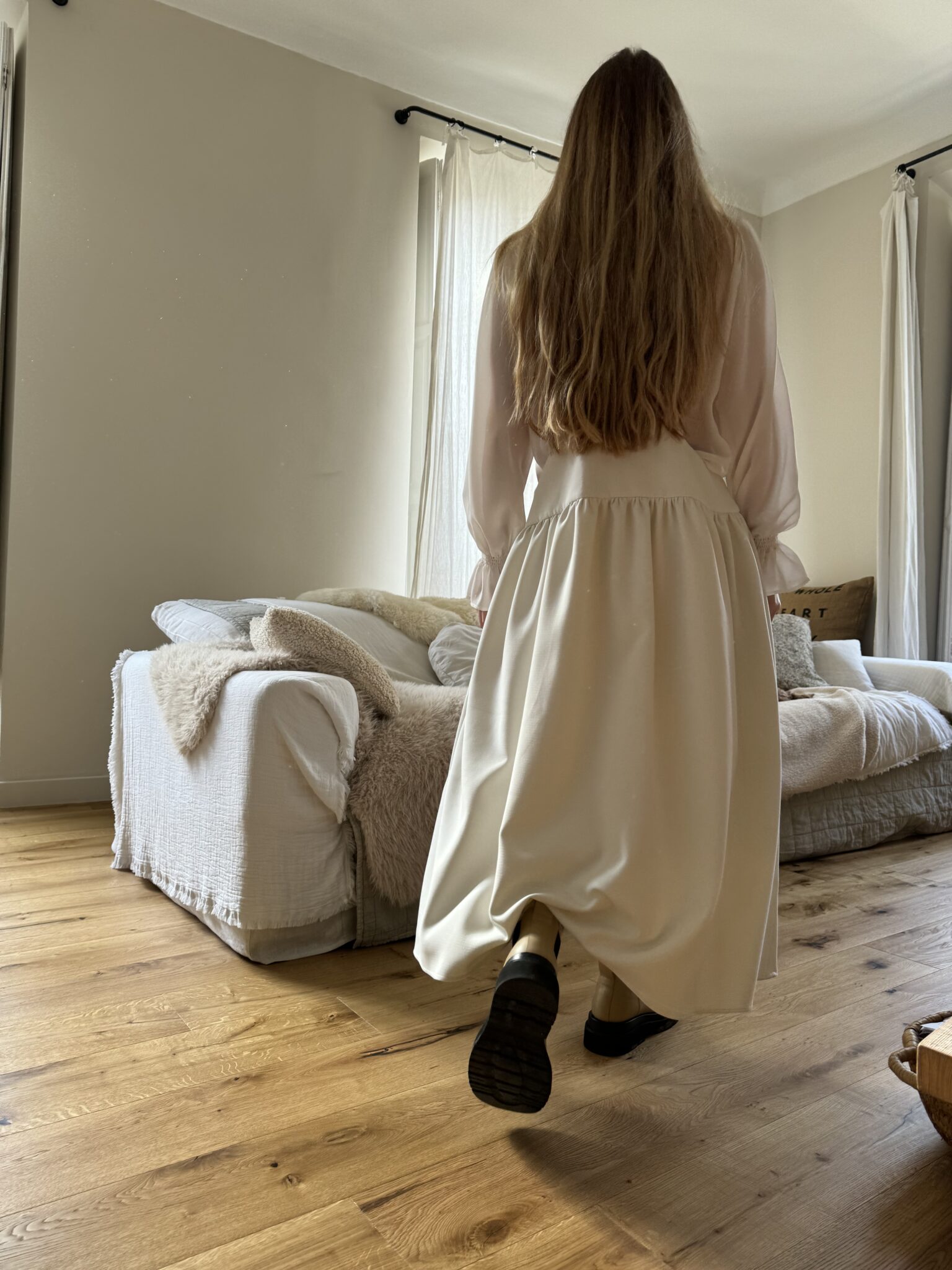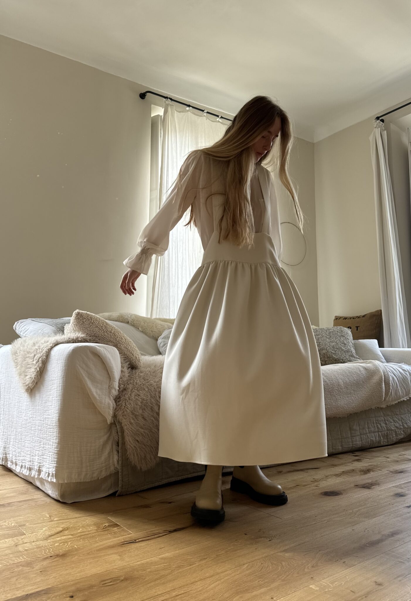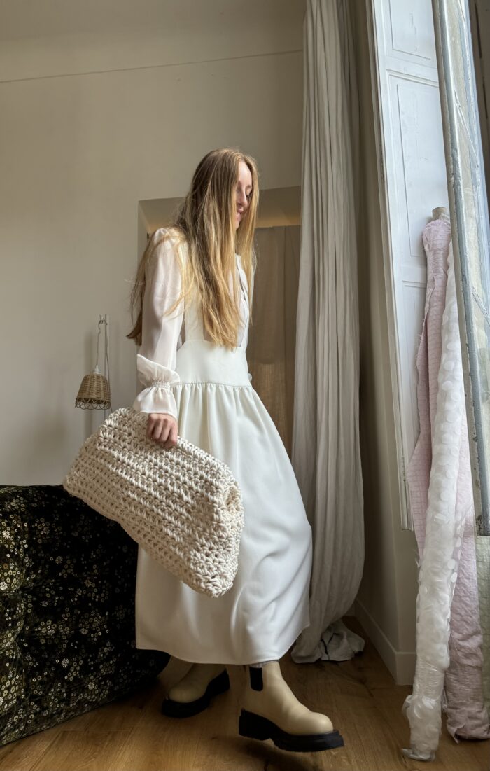 Jupe – Salopette dans un sublime crêpe écru. Création unique, à la coupe japonisante et minimaliste. Poches, non transparente. PIÈCE UNIQUE
