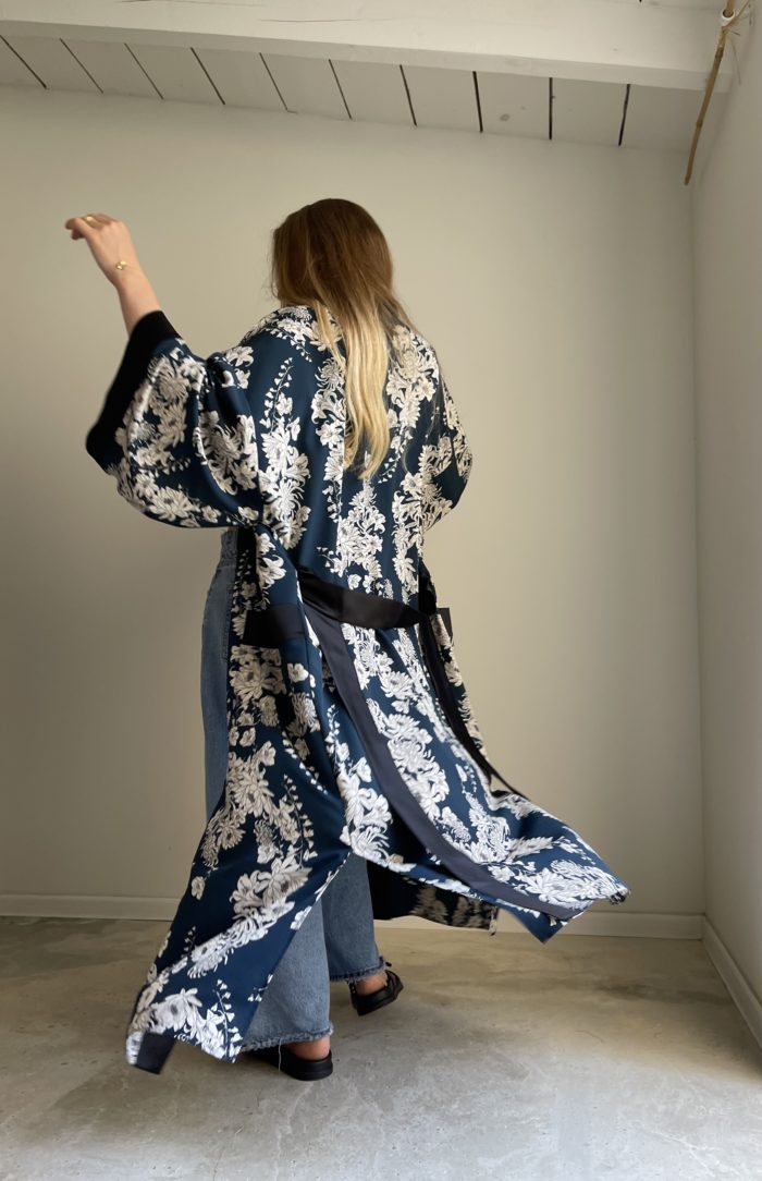 Veste Kimono fleurie, entièrement soulignée d’un crêpe de viscose envers satin noir, lui donnant caractère et élégance. Ceinture & poches plaquées. Une coupe loose & minimaliste. La pièce tendance et originale à avoir dans son dressing ! PIÈCE UNIQUEÂ