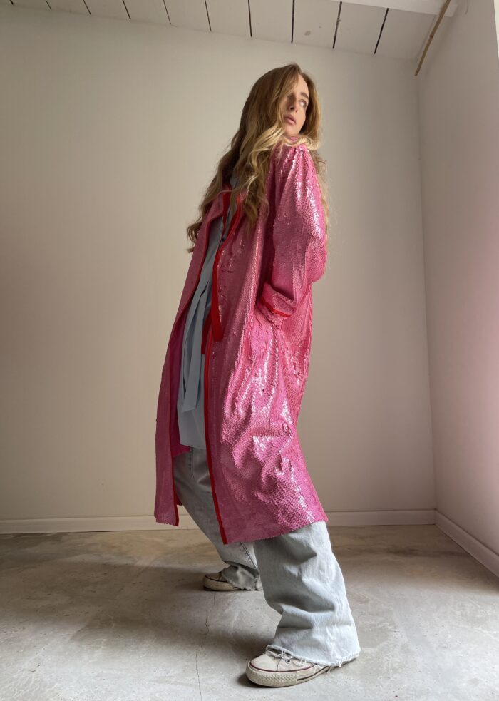 Manteau sequins rose, entièrement doublé et souligné de biais rouge, ruban velours ras au col, poches latérales. Une PIÈCE UNIQUE et ORIGINALE ! Un COUP DE CŒUR !
