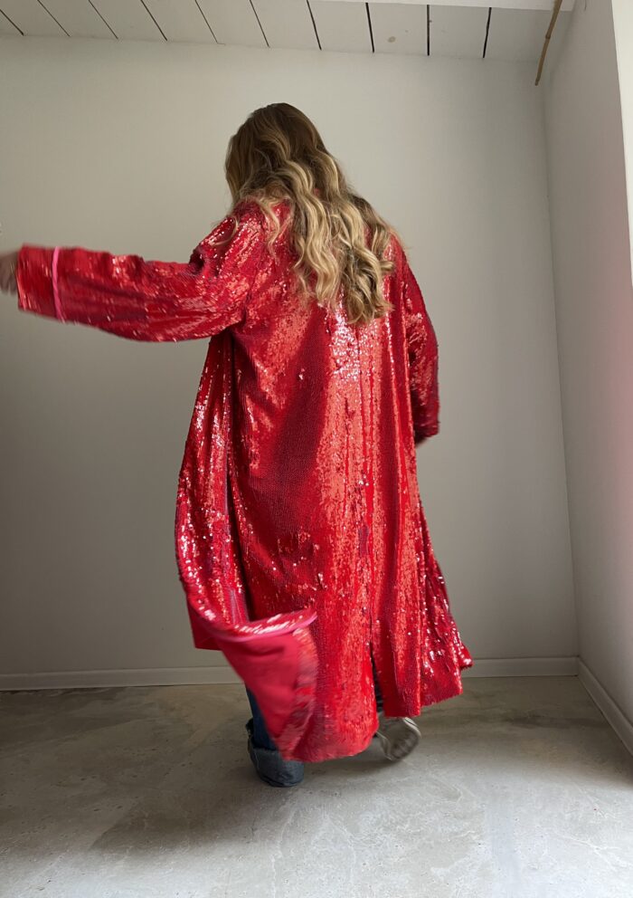 Manteau sequins rouge, entièrement doublé et souligné de biais rose pâle, ruban velours ras au col, poches latérales. Une PIÈCE UNIQUE et ORIGINALE ! Un COUP DE CŒUR !