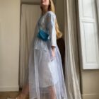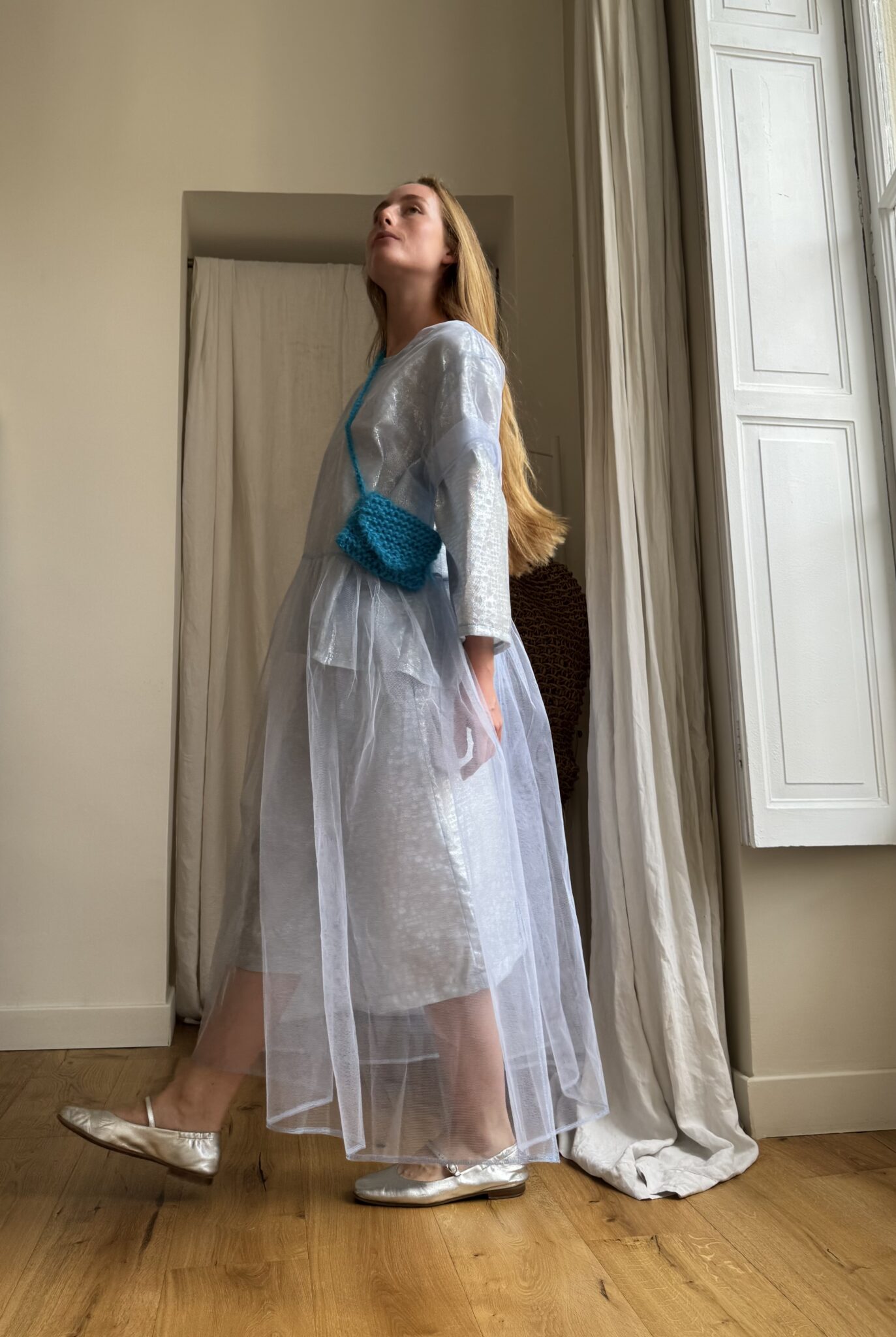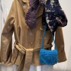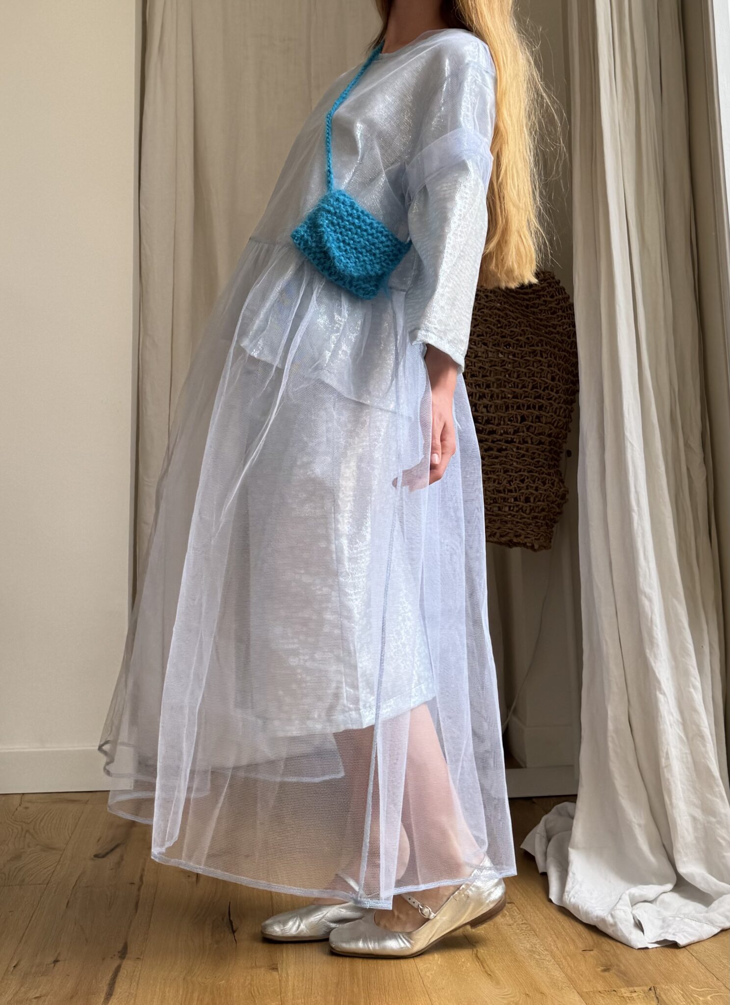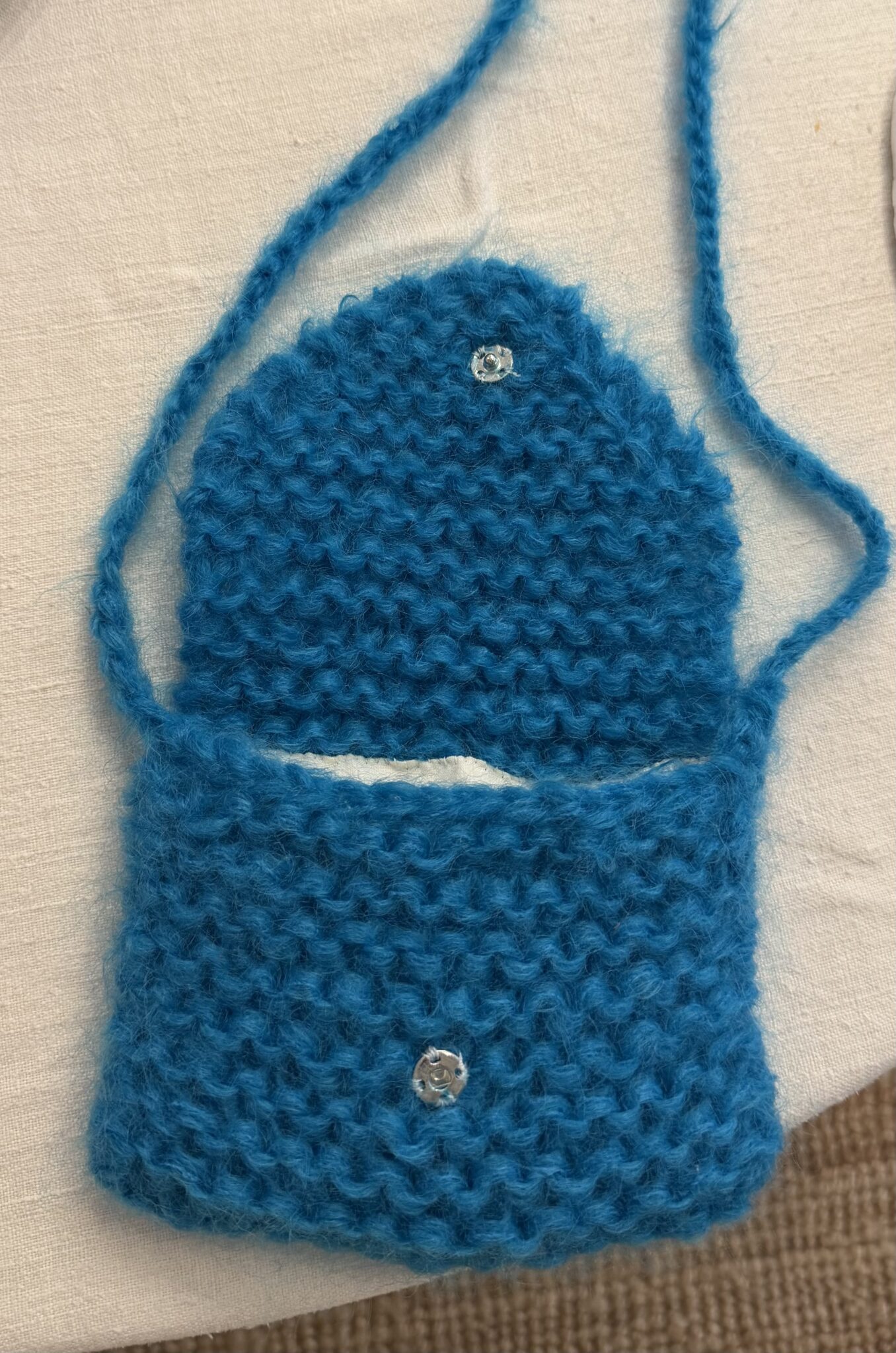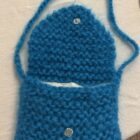 Mini sac bandoulière au crochet, en kid mohair bleu, fait main, fond de sac en toile à beurre écru, fermeture à rabat avec pression. PIÈCE UNIQUE