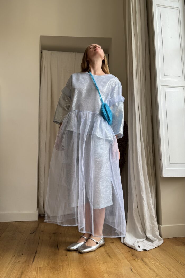 Mini sac bandoulière au crochet, en kid mohair bleu, fait main, fond de sac en toile à beurre écru, fermeture à rabat avec pression. PIÈCE UNIQUE