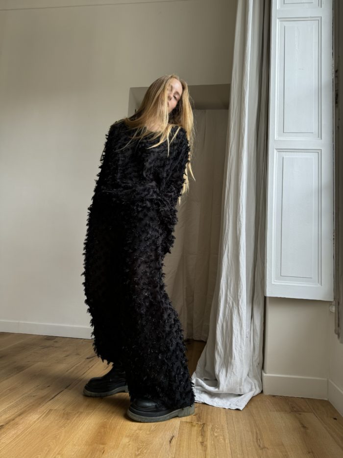 Pantalon « ETIENNE » dans un superbe jacquard dévoré. Taille sur élastique, poches latérales. Pantalon légèrement transparent, idéal à porter en superposition avec le sweat-shirt ou ma robe teeshirt dans le même tissu. PIÈCE UNIQUE.