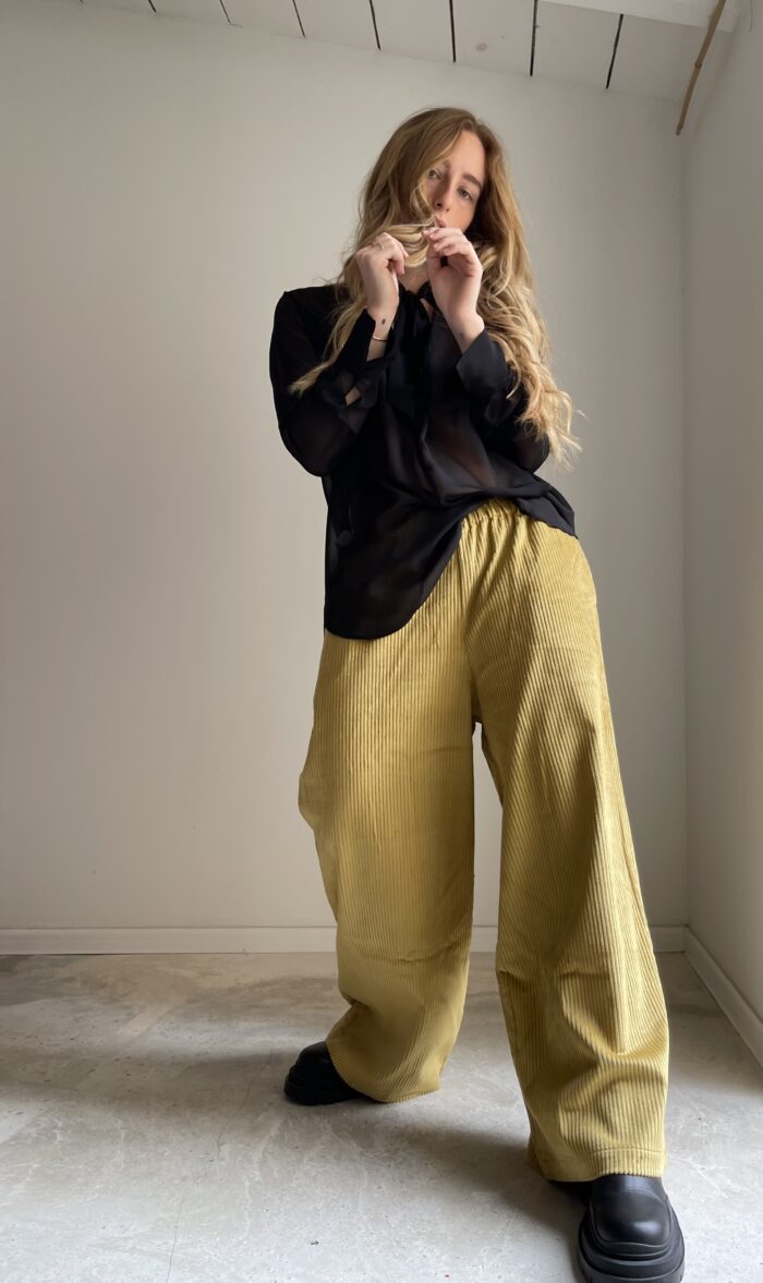 Pantalon « ETIENNE » en velours côtelé ocre, velours très lumineux, une coupe loose, jambes légèrement évasées, taille élastiquée, poches latérales. La coupe parfaite ! ÉDITION LIMITÉE !