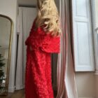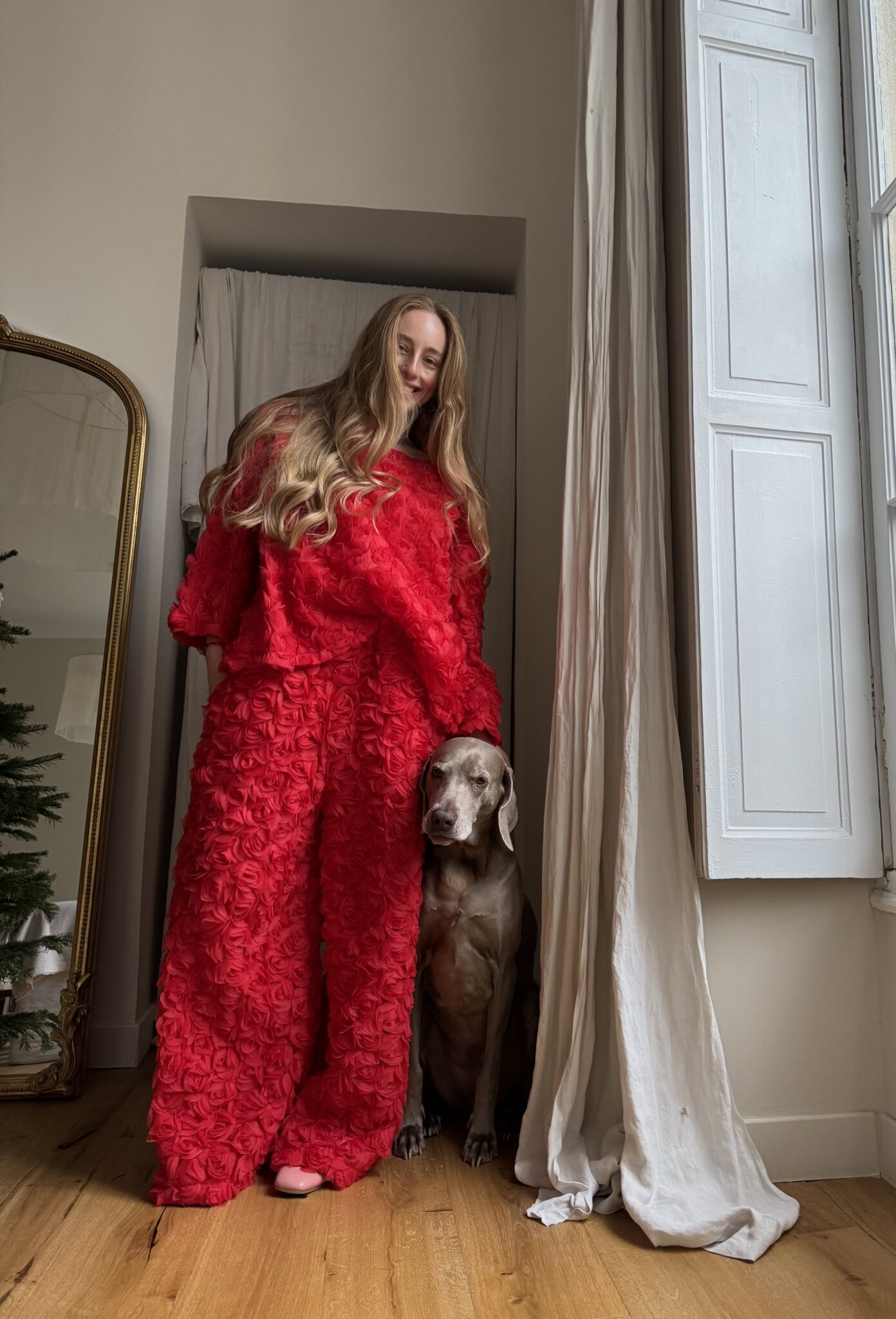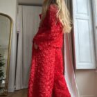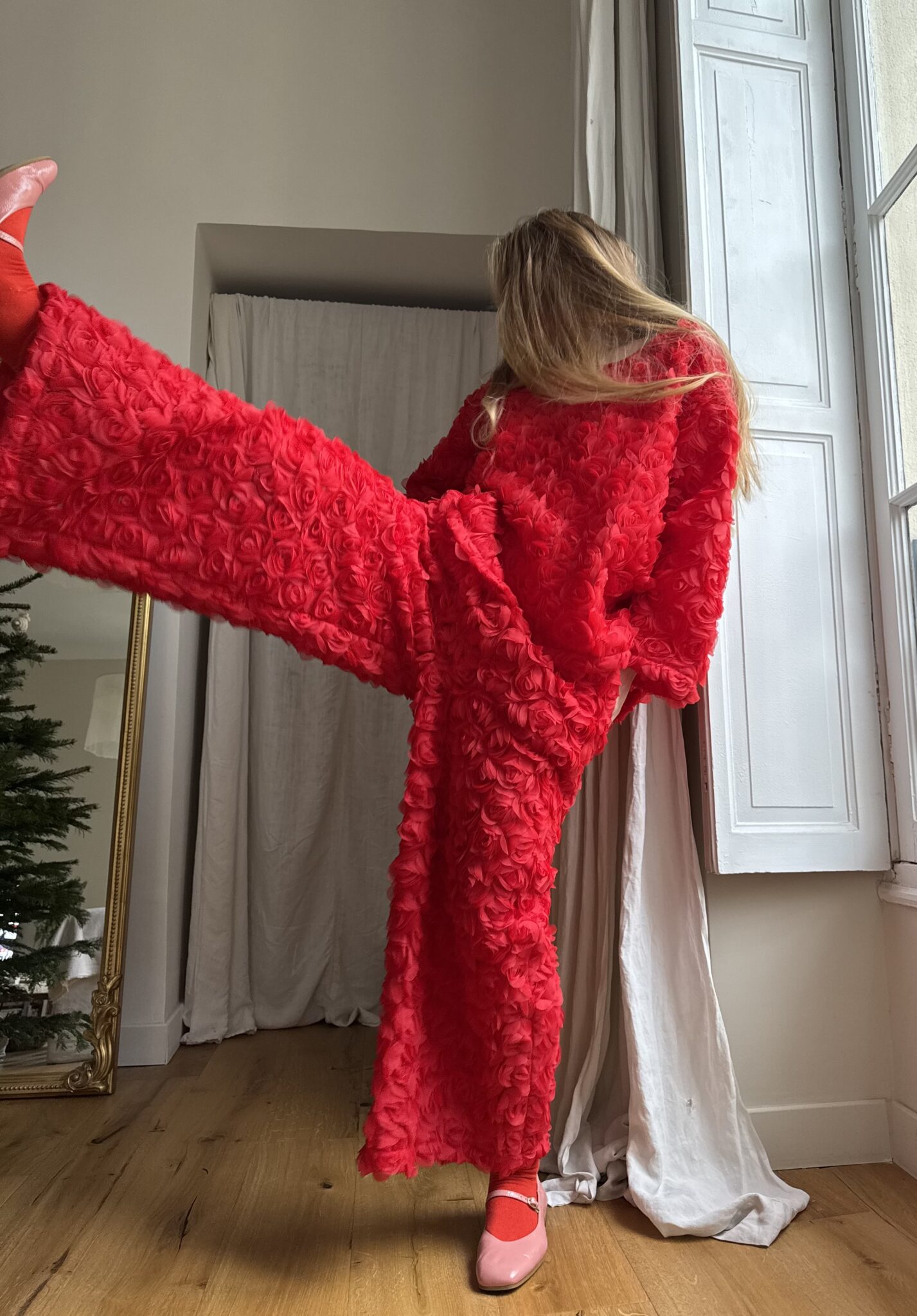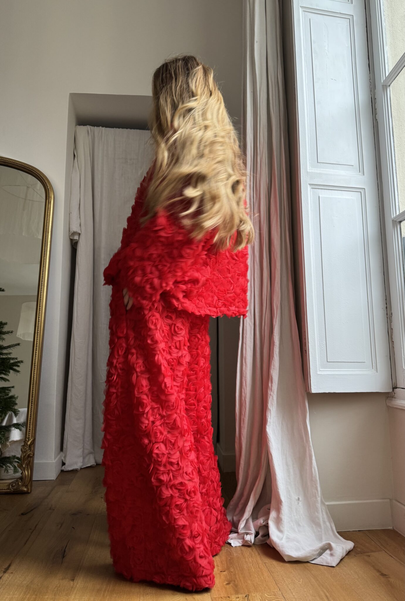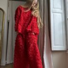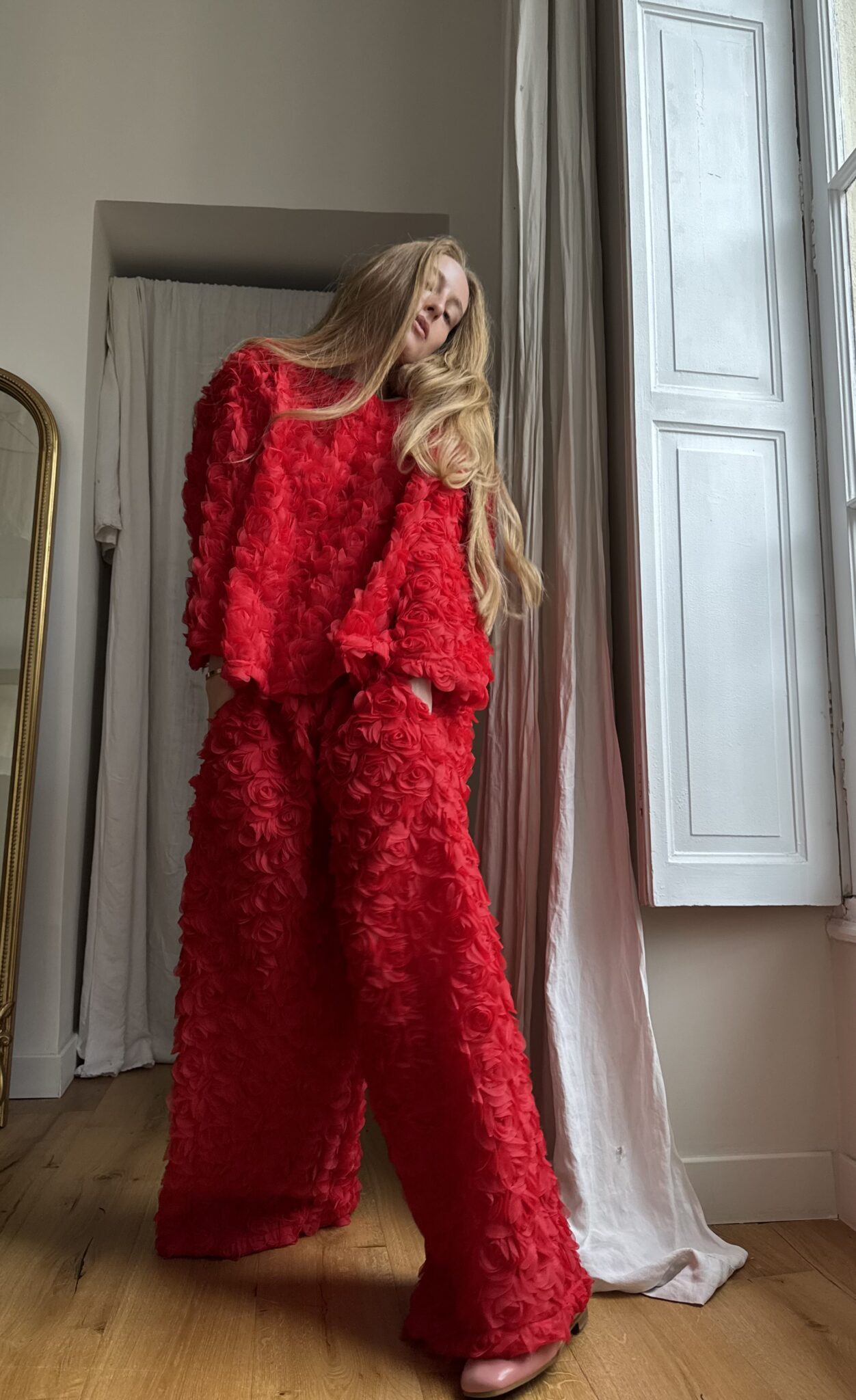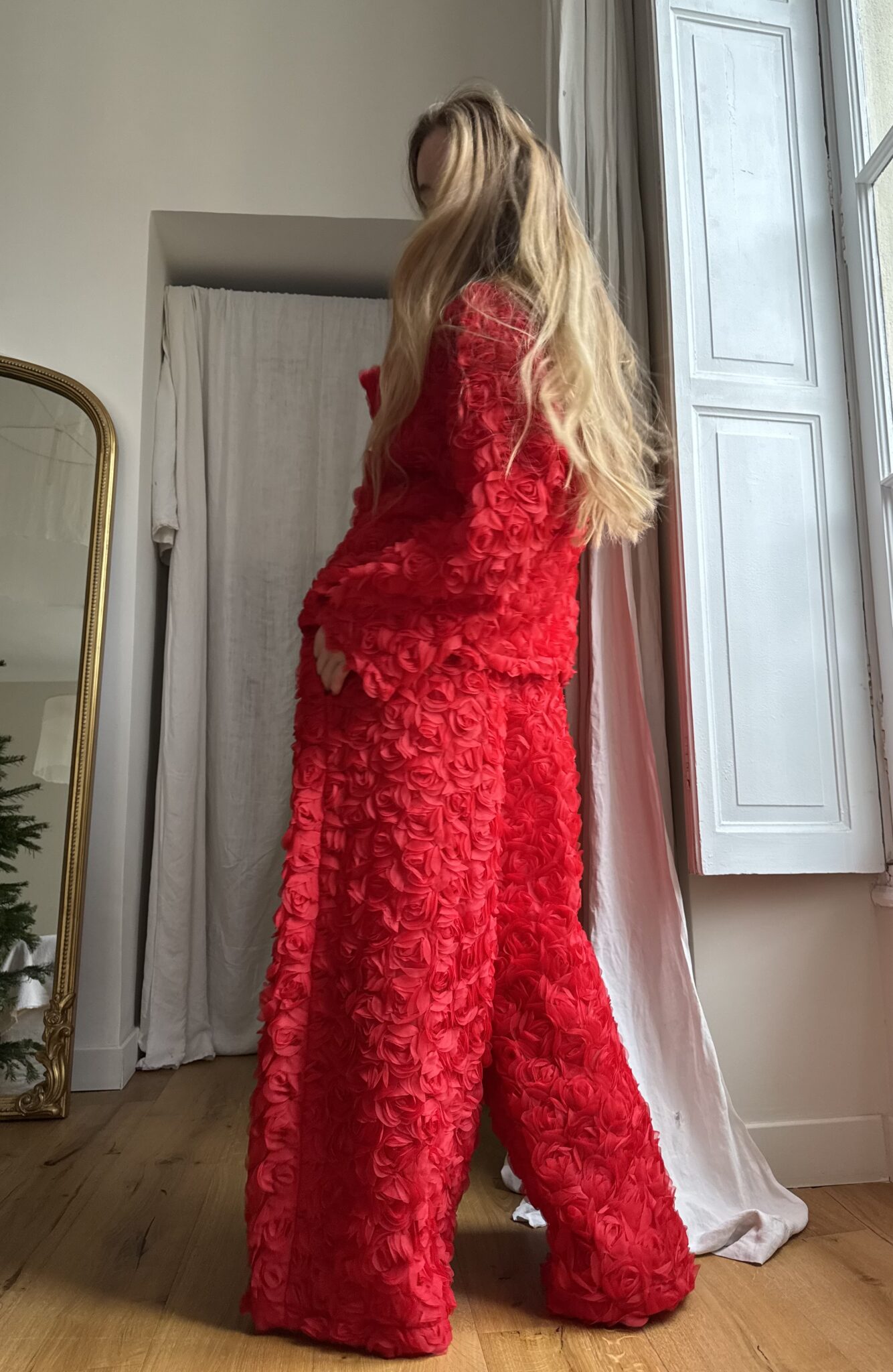 Pantalon « ETIENNE » dans un sublime tissu en tulle orné de roses. Taille sur élastique, poches latérales. Jambes larges légèrement évasées.
