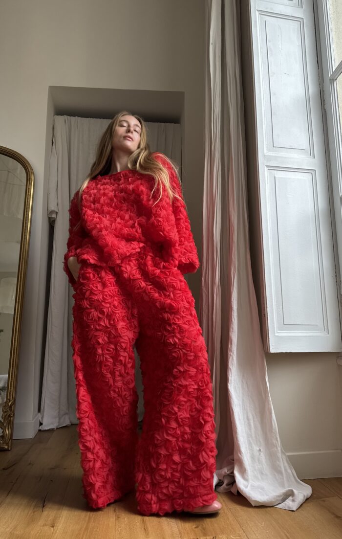 Pantalon « ETIENNE » dans un sublime tissu en tulle orné de roses. Taille sur élastique, poches latérales. Jambes larges légèrement évasées.