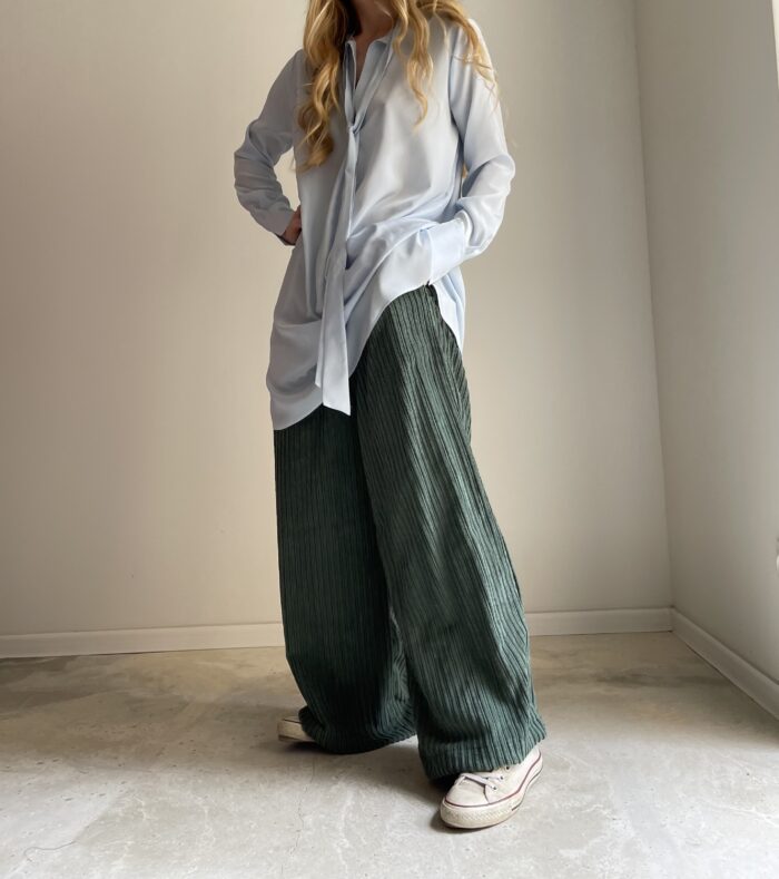 Pantalon « ETIENNE » en velours côtelé vert sapin de grande qualité, une coupe loose, jambes légèrement évasées, taille élastiquée, poches latérales. La coupe parfaite ! PIÈCE UNIQUE !
