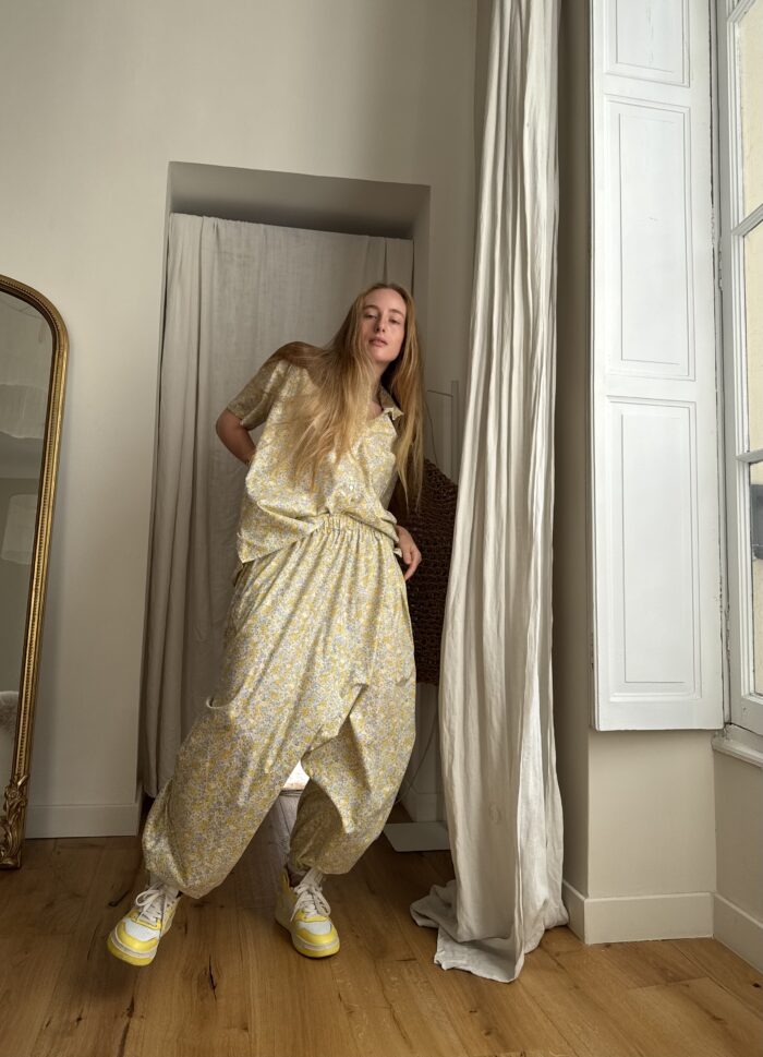 Pantalon « GASTON » ballon, en coton fleuri. Taille froncée sur élastique, poches latérales et poches plaquées à rabat au dos. Élastique à la cheville pour donner un côté ballon. Une coupe unisexe, minimaliste et oversize. PETITE ÉDITION.