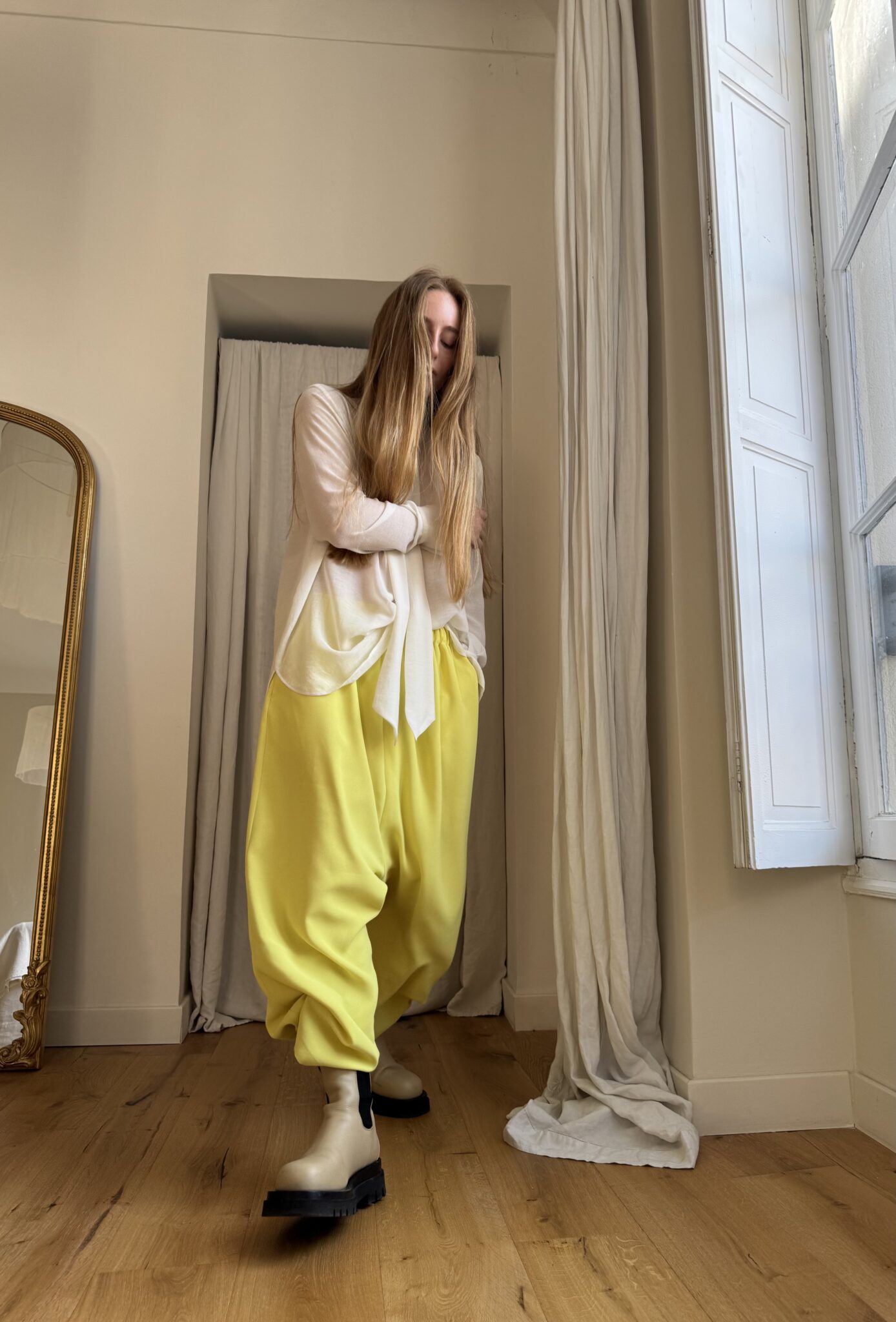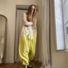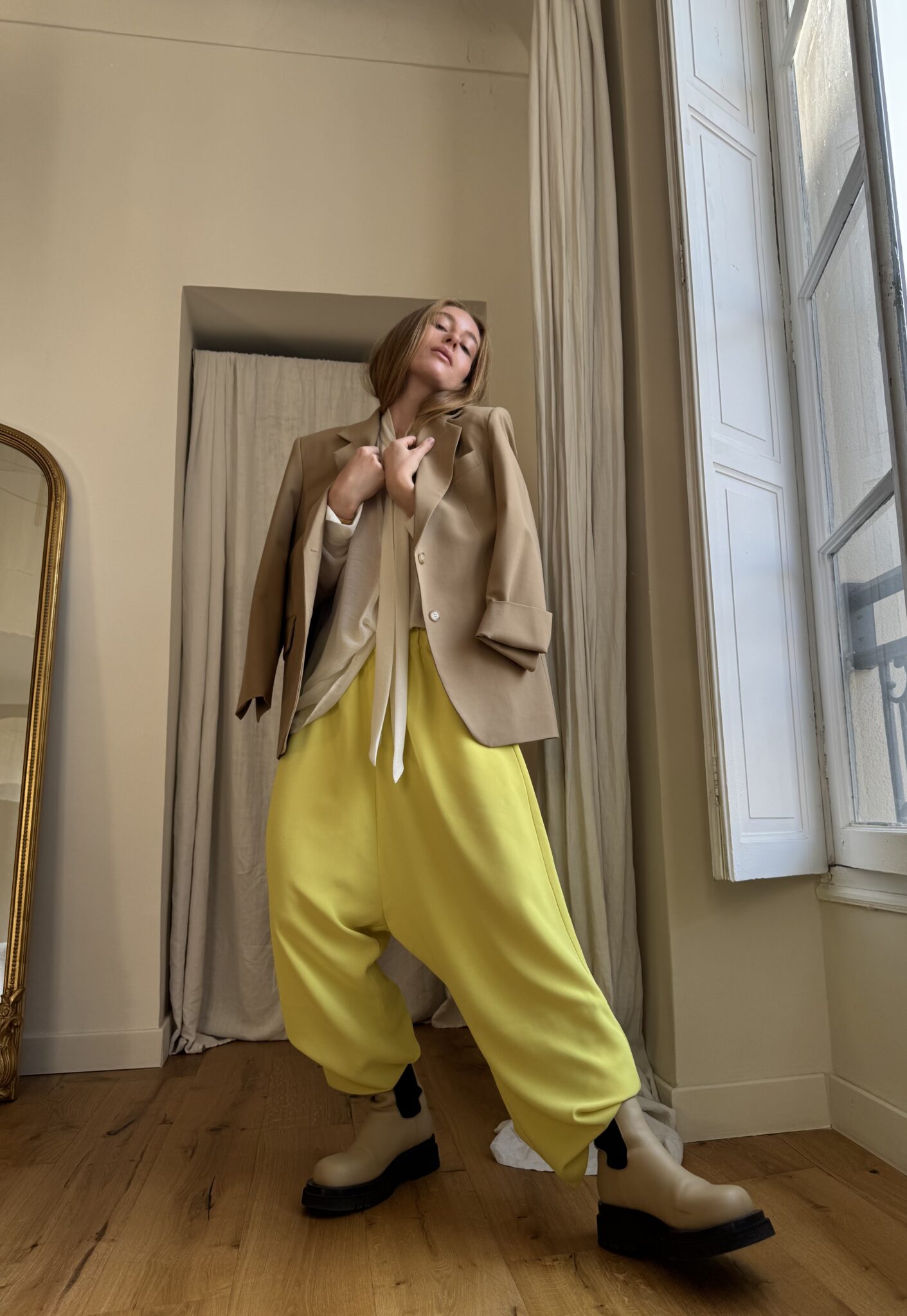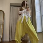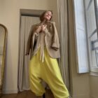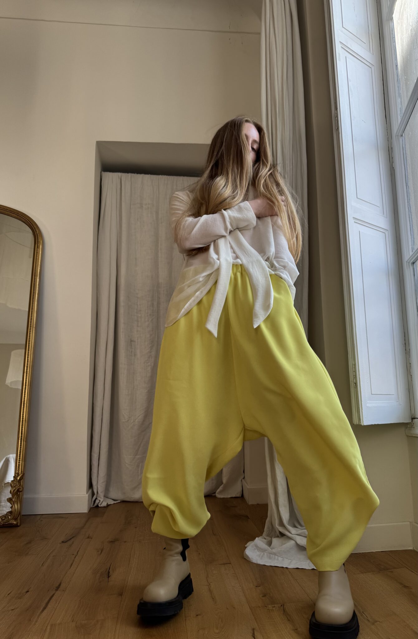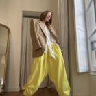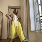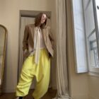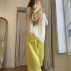 Pantalon « GASTON » en crêpe jaune fluo. Taille sur élastique, poches latérales. Poches plaquées à rabat au dos. Une coupe unisexe, oversize.