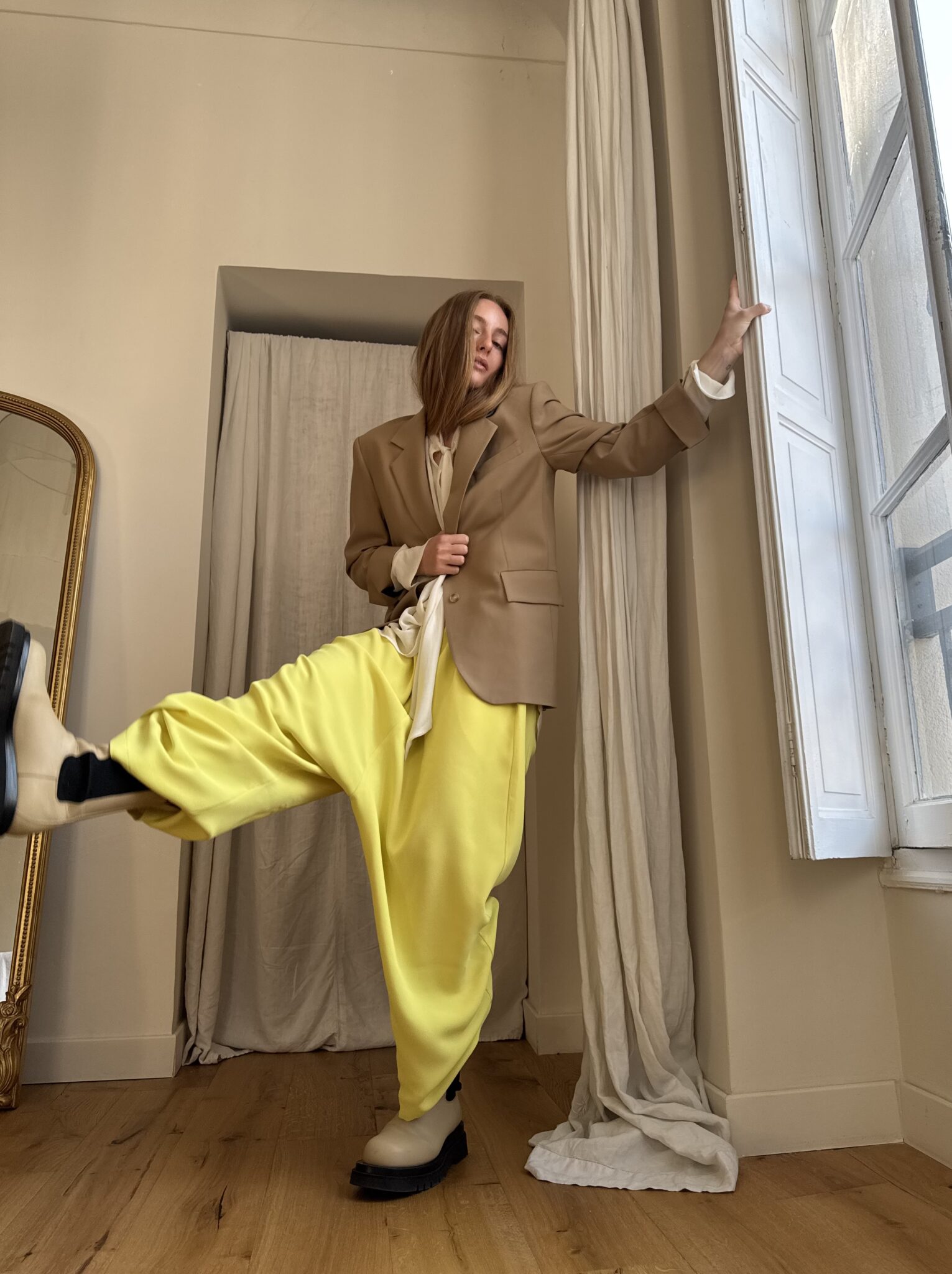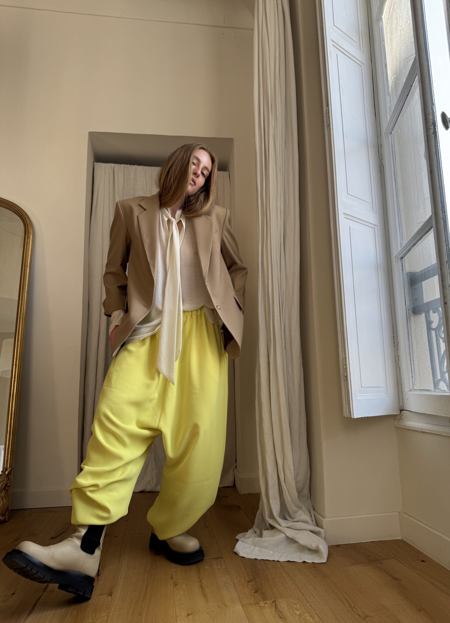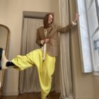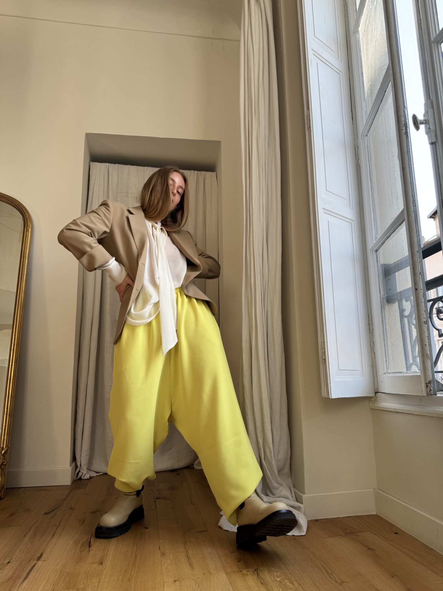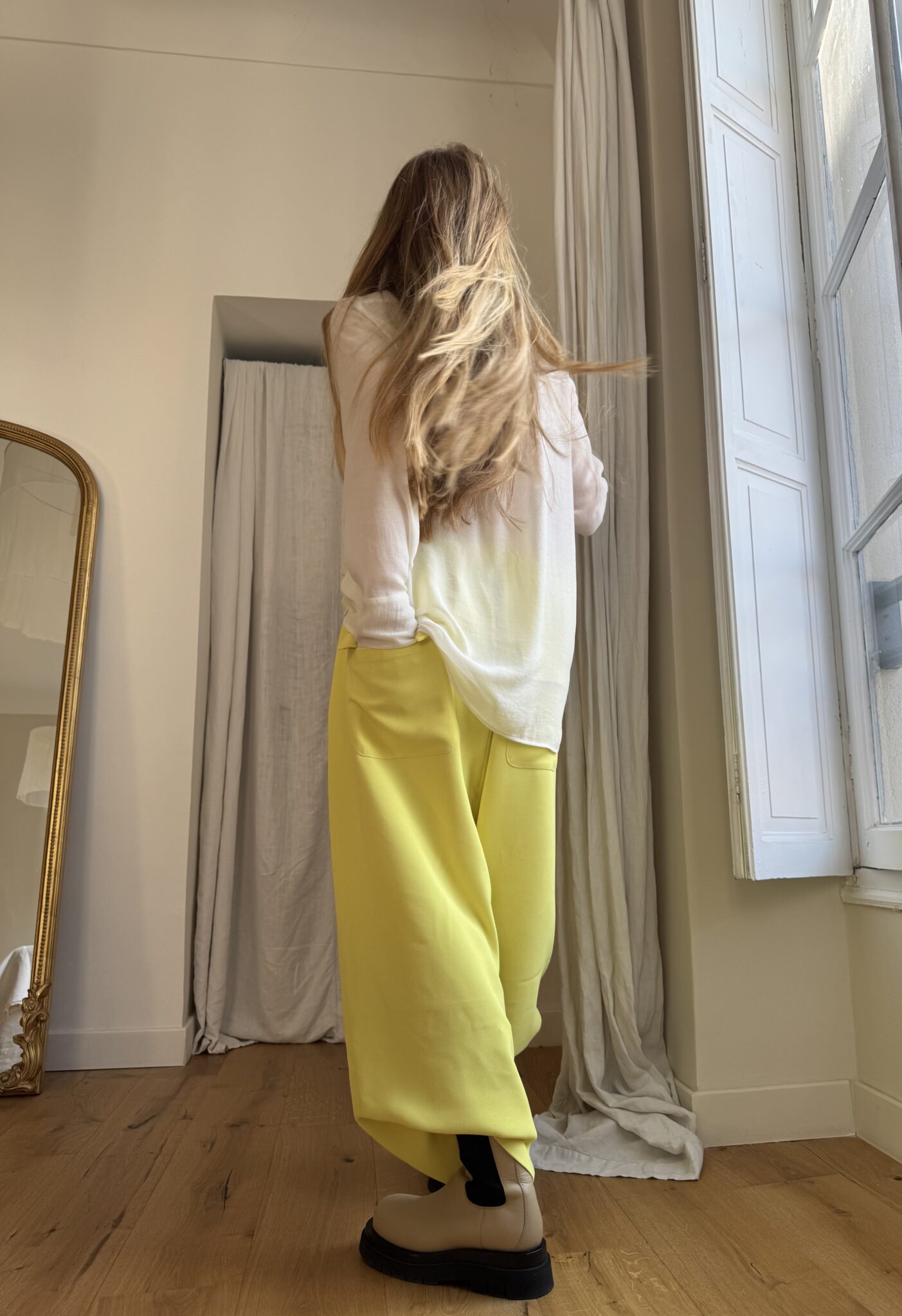 Pantalon « GASTON » en crêpe jaune fluo. Taille sur élastique, poches latérales. Poches plaquées à rabat au dos. Une coupe unisexe, oversize.