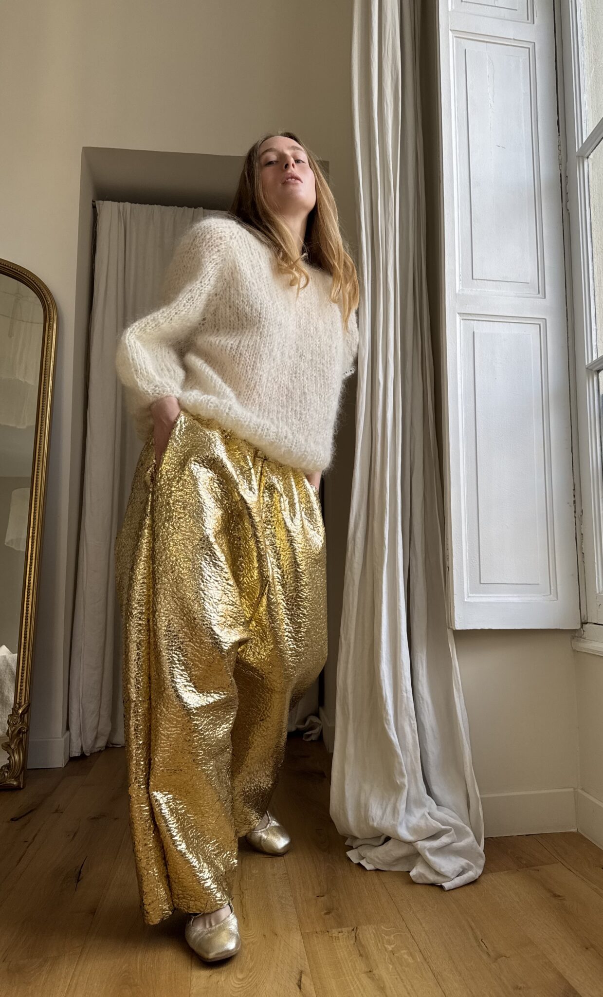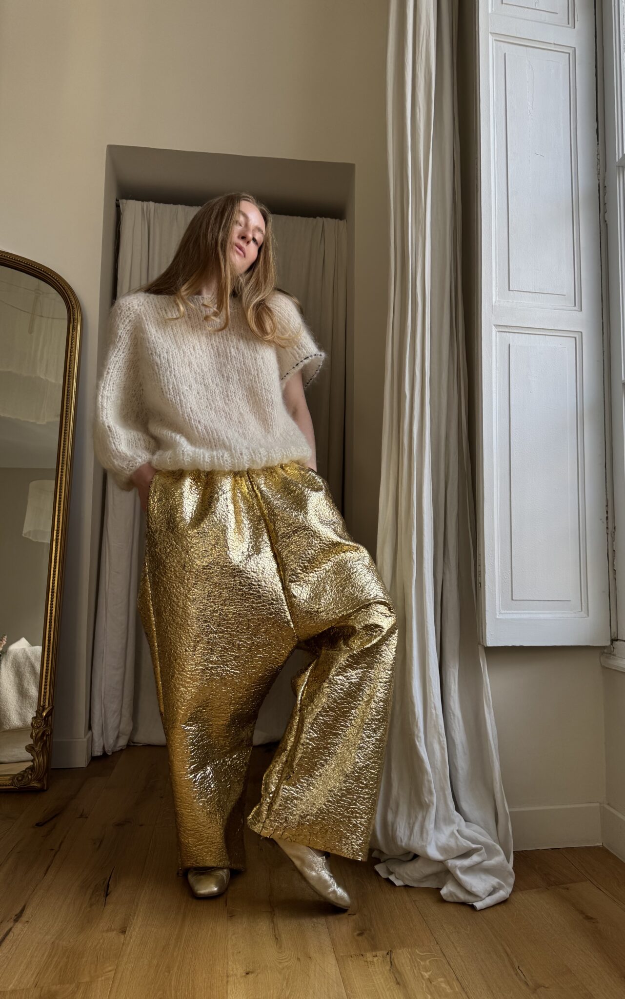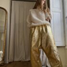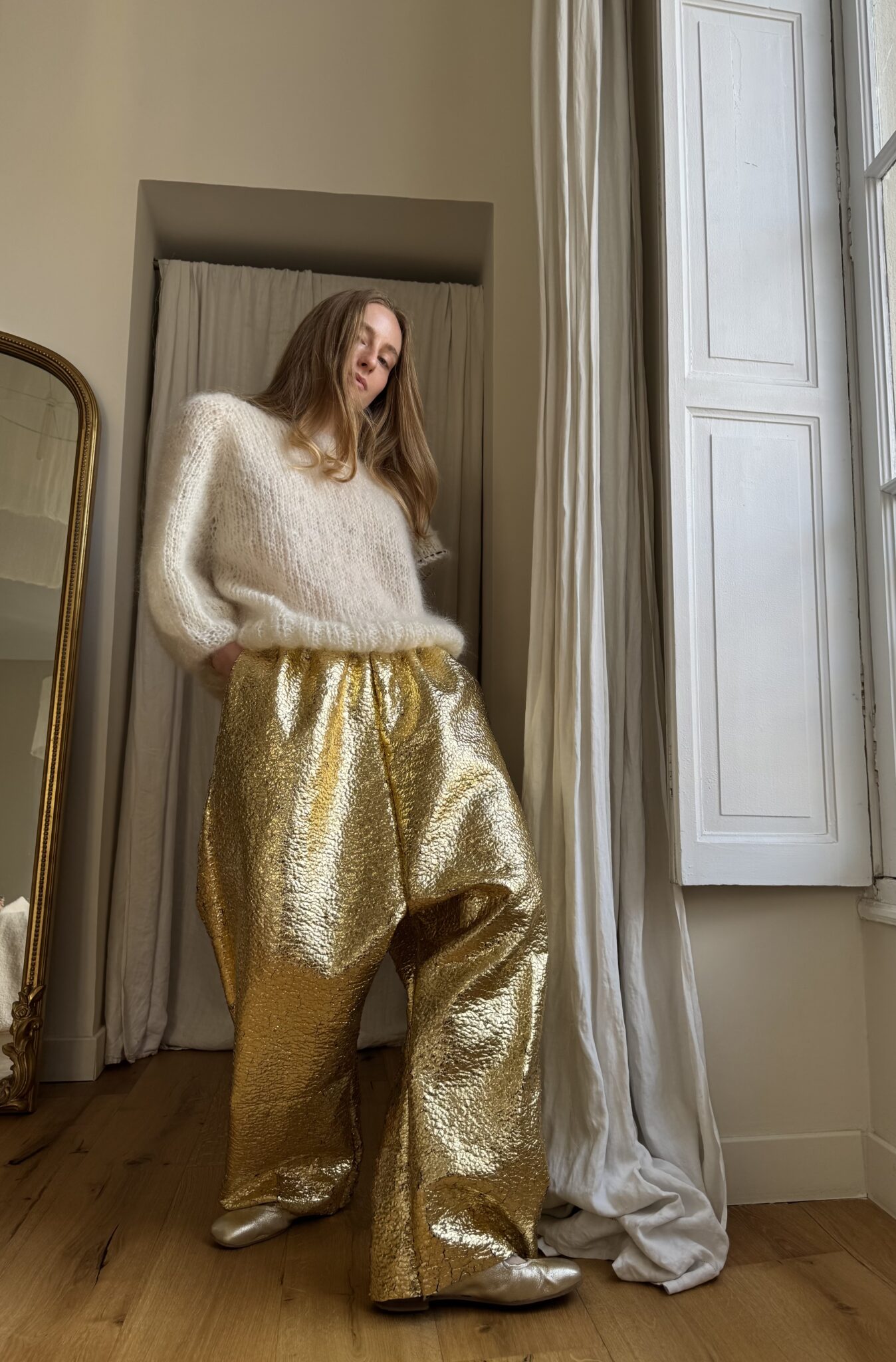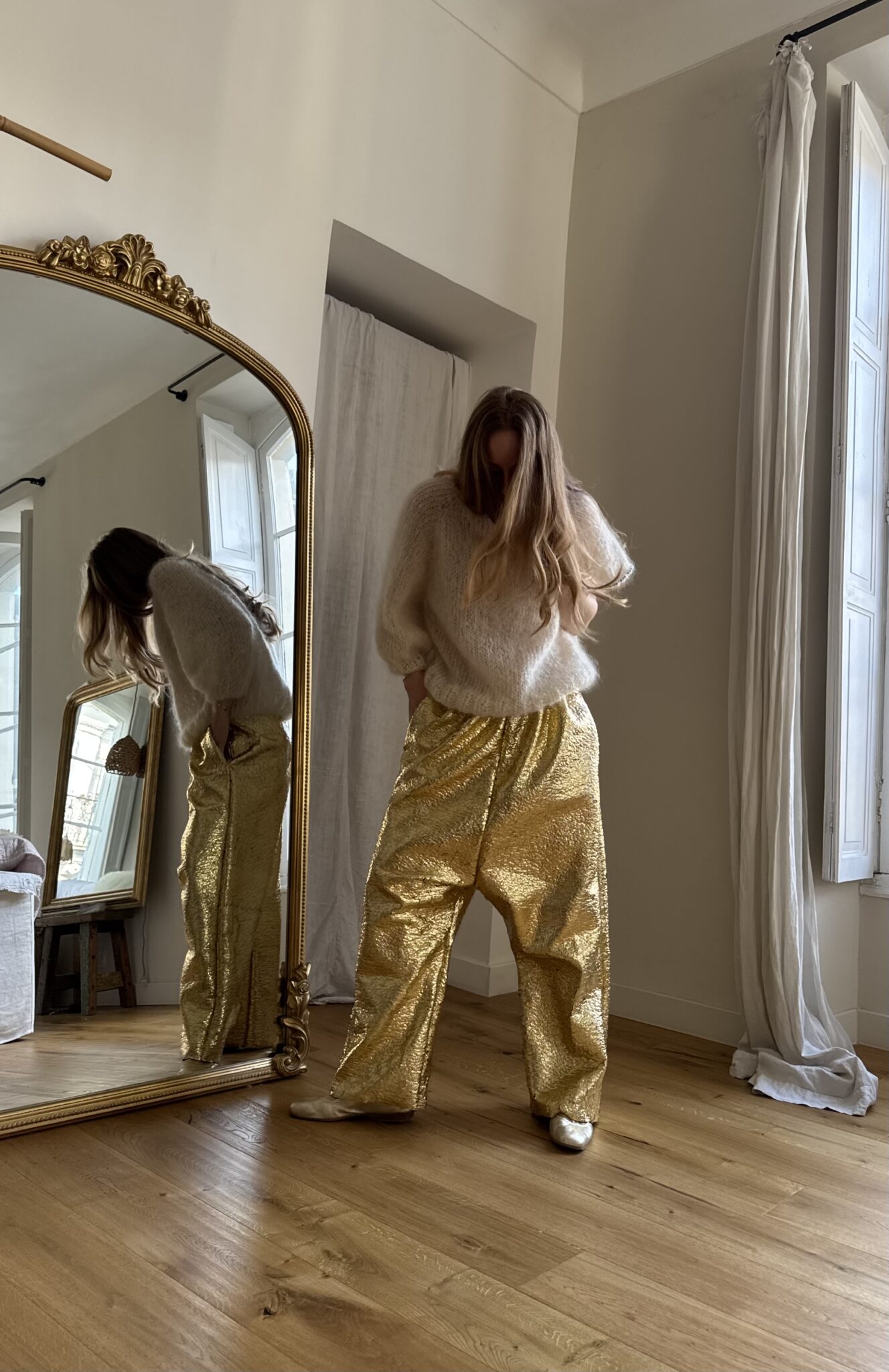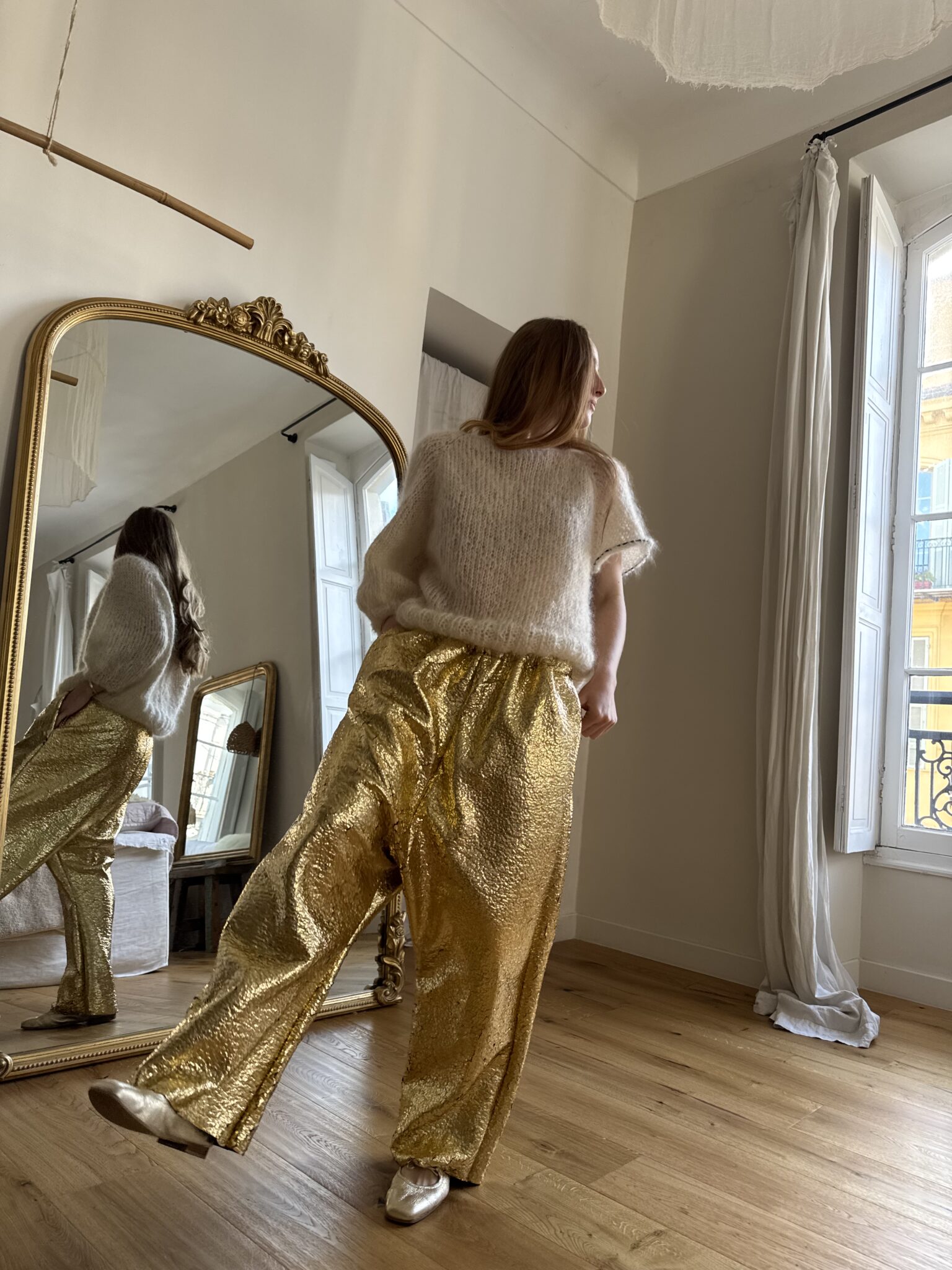 Pantalon « GASTON » dans un tissu doré écaillé sur fond noir. Taille sur élastique, poches latérales. Une coupe loose et oversize, pour un pantalon haute couture, stylé et unique. PIÈCE UNIQUE