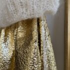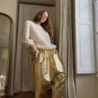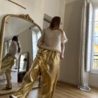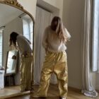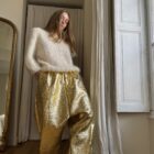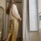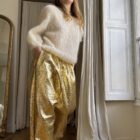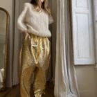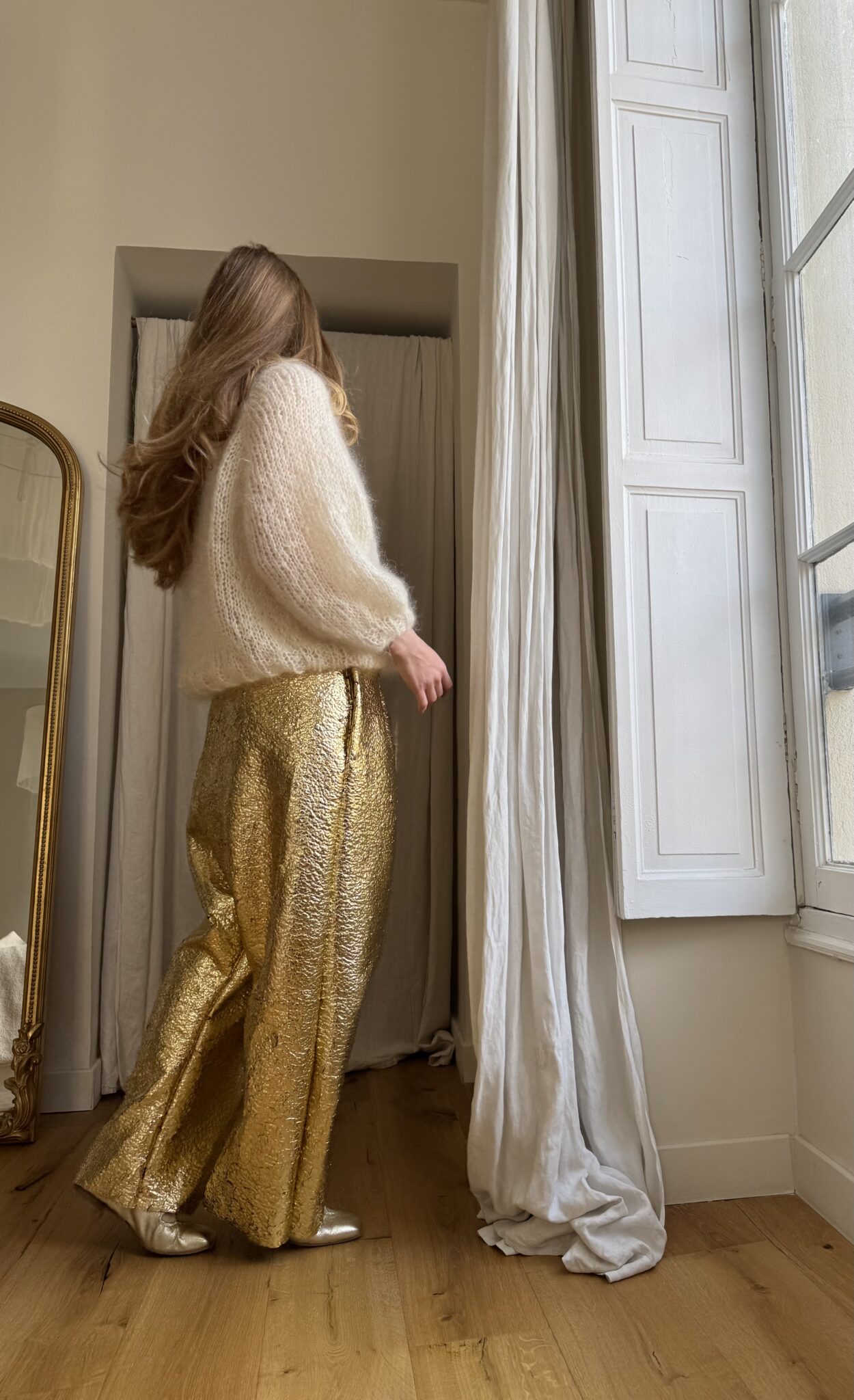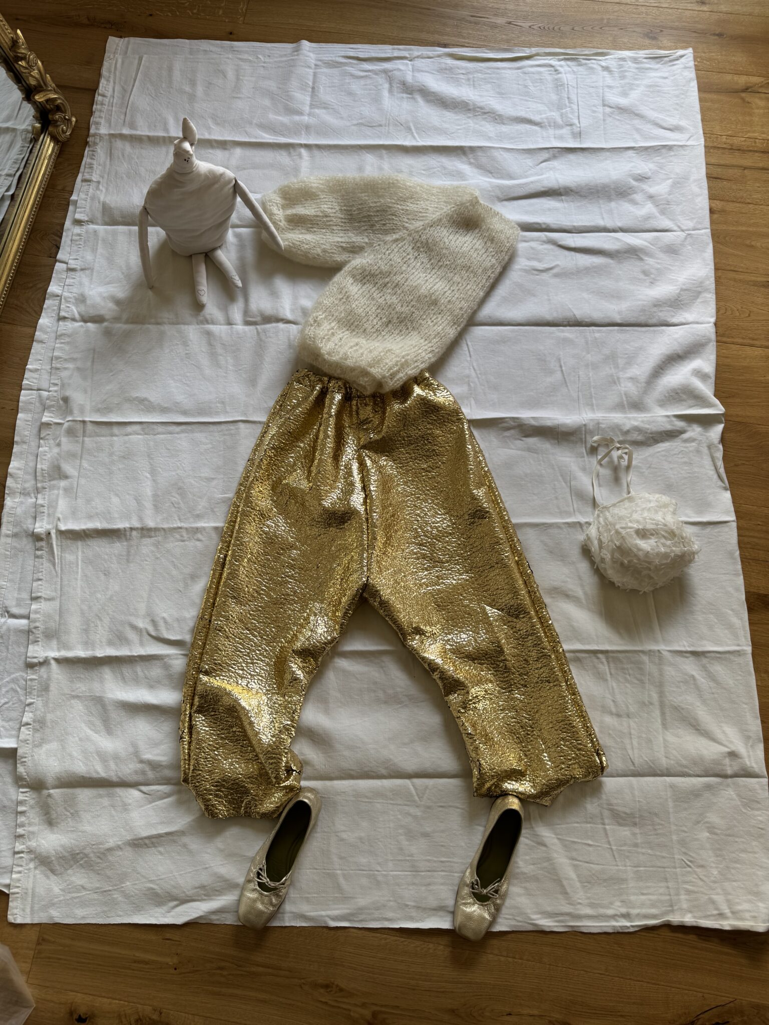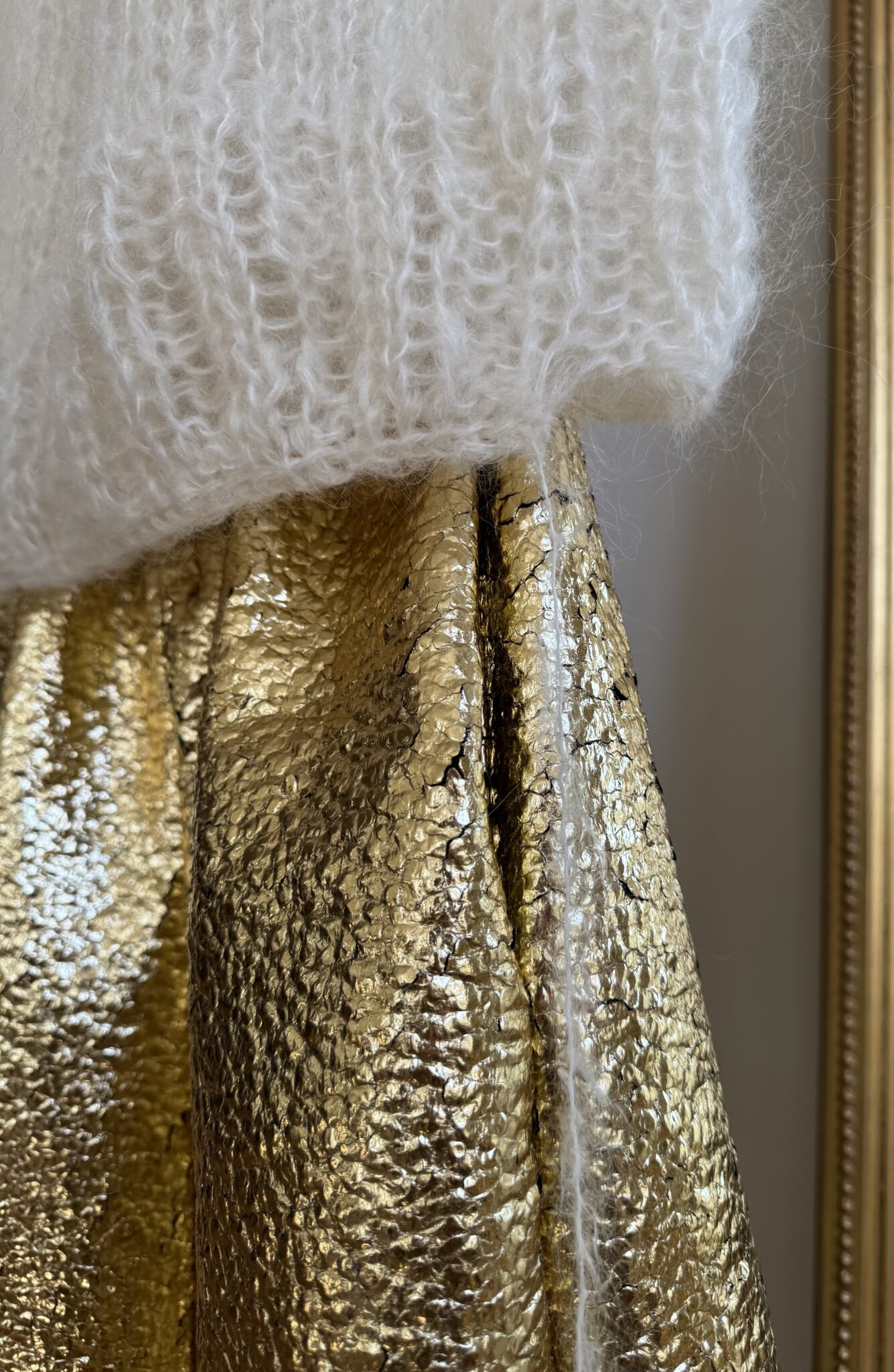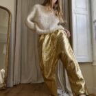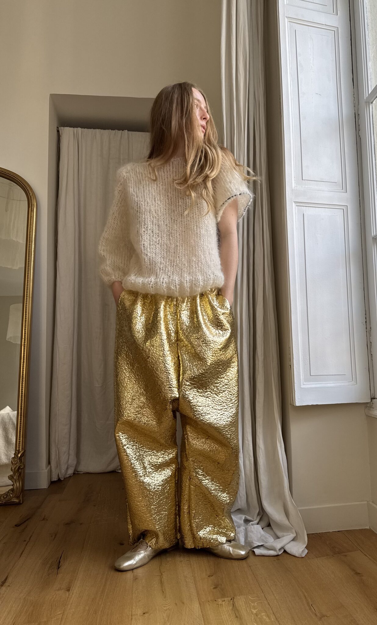 Pantalon « GASTON » dans un tissu doré écaillé sur fond noir. Taille sur élastique, poches latérales. Une coupe loose et oversize, pour un pantalon haute couture, stylé et unique. PIÈCE UNIQUE