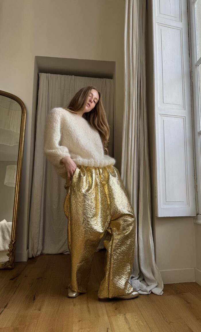 Pantalon « GASTON » dans un tissu doré écaillé sur fond noir. Taille sur élastique, poches latérales. Une coupe loose et oversize, pour un pantalon haute couture, stylé et unique. PIÈCE UNIQUE