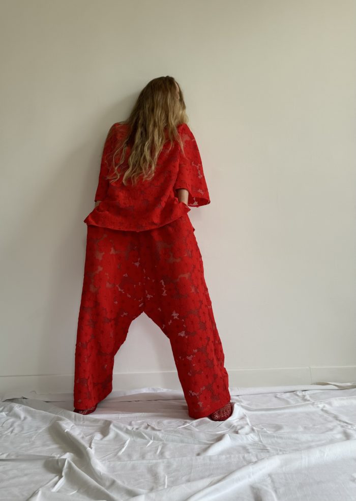 Pantalon « GASTON » dans un sublime tissu jacquard fleuri rouge vermillon. Une coupe loose et minimaliste, style japonisant, fond de pantalon bas, poches, taille sur élastique, une pièce stylée et unique.