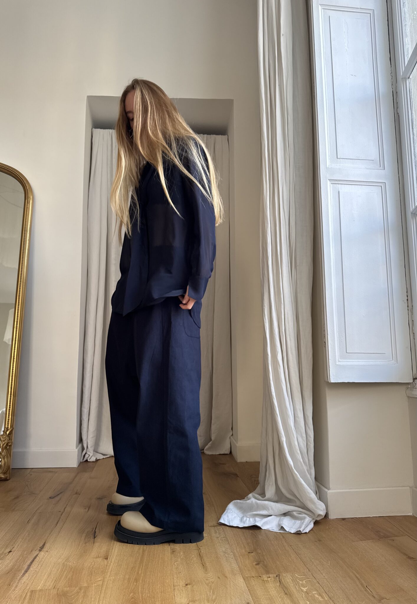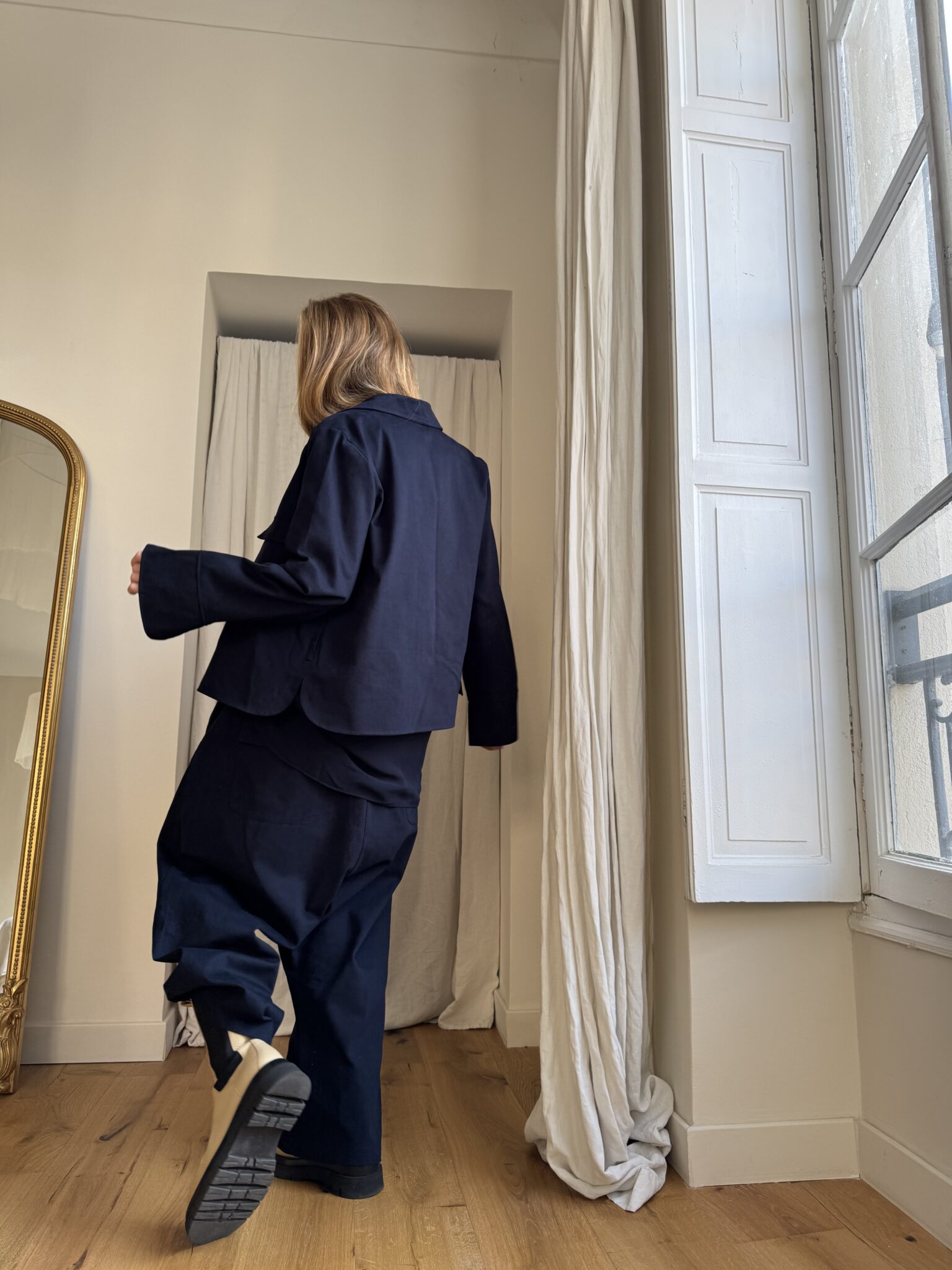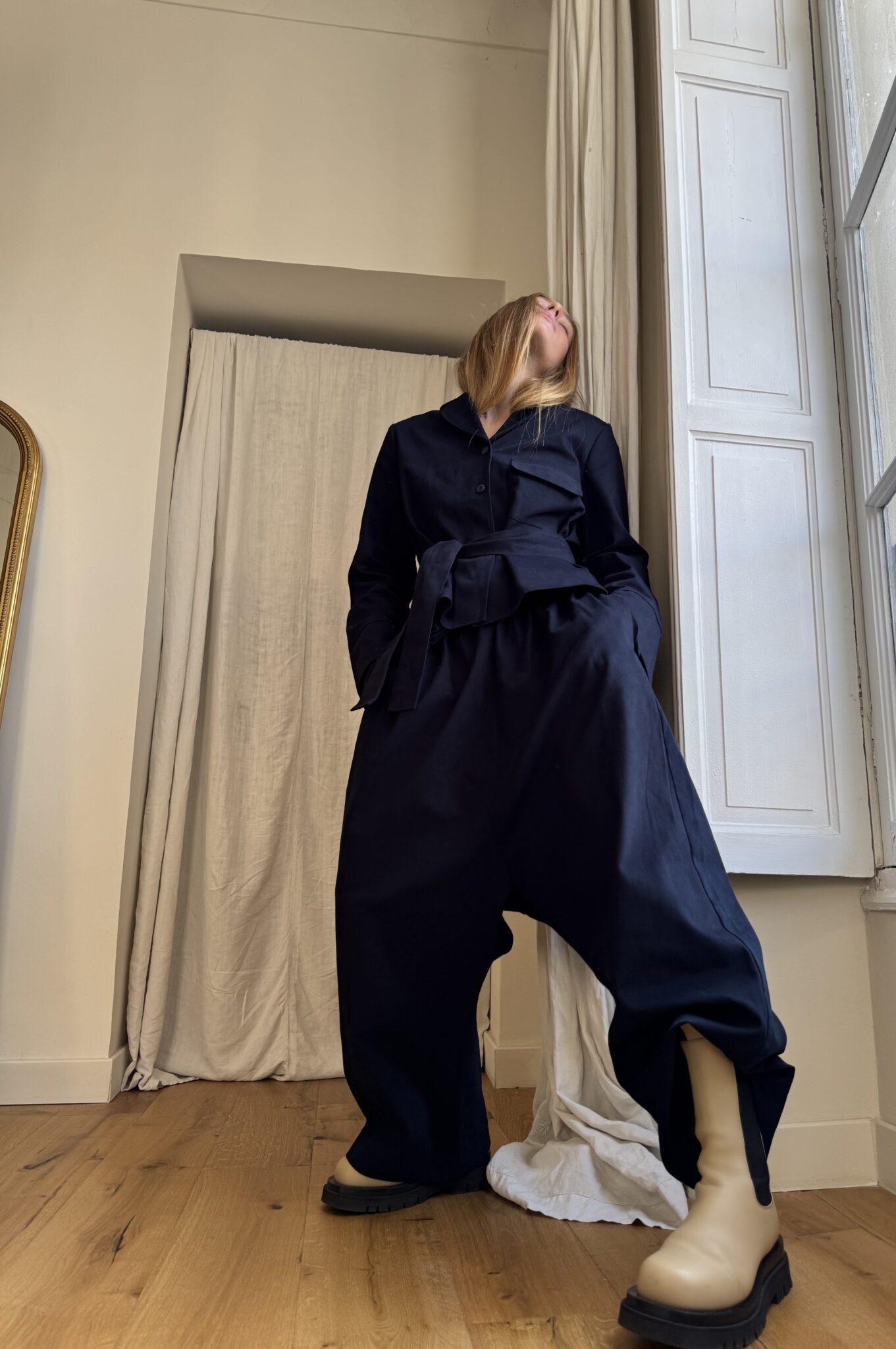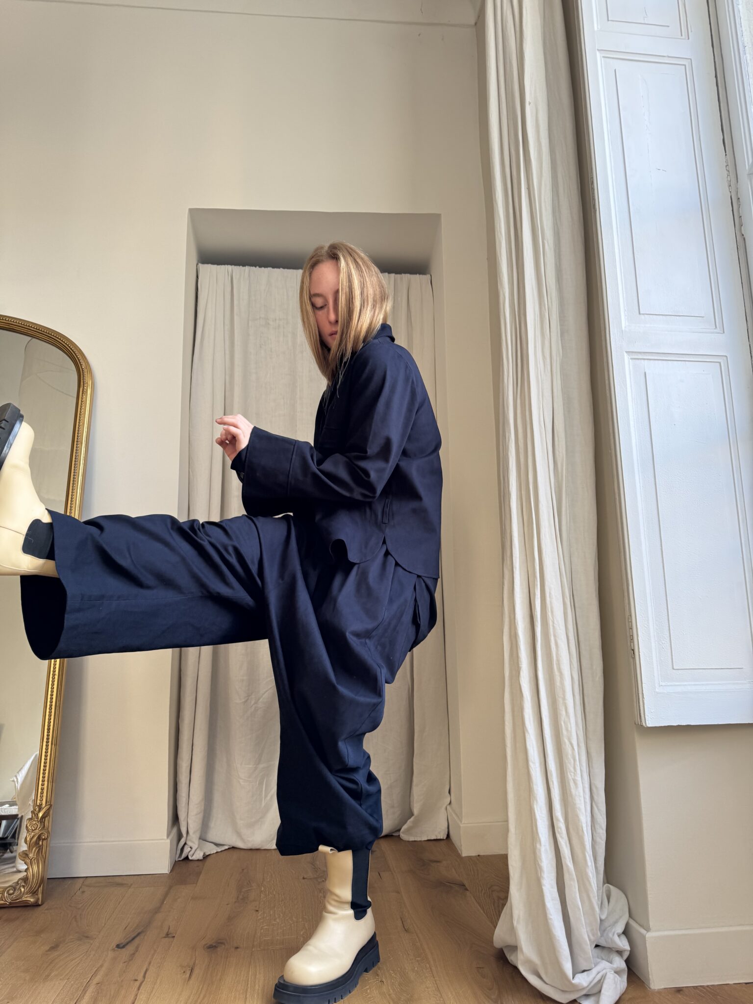 Pantalon « GASTON » en gabardine de coton bleu marine. Taille sur élastique, poches latérales. Poches plaquées à rabat au dos. Une coupe unisexe, oversize.